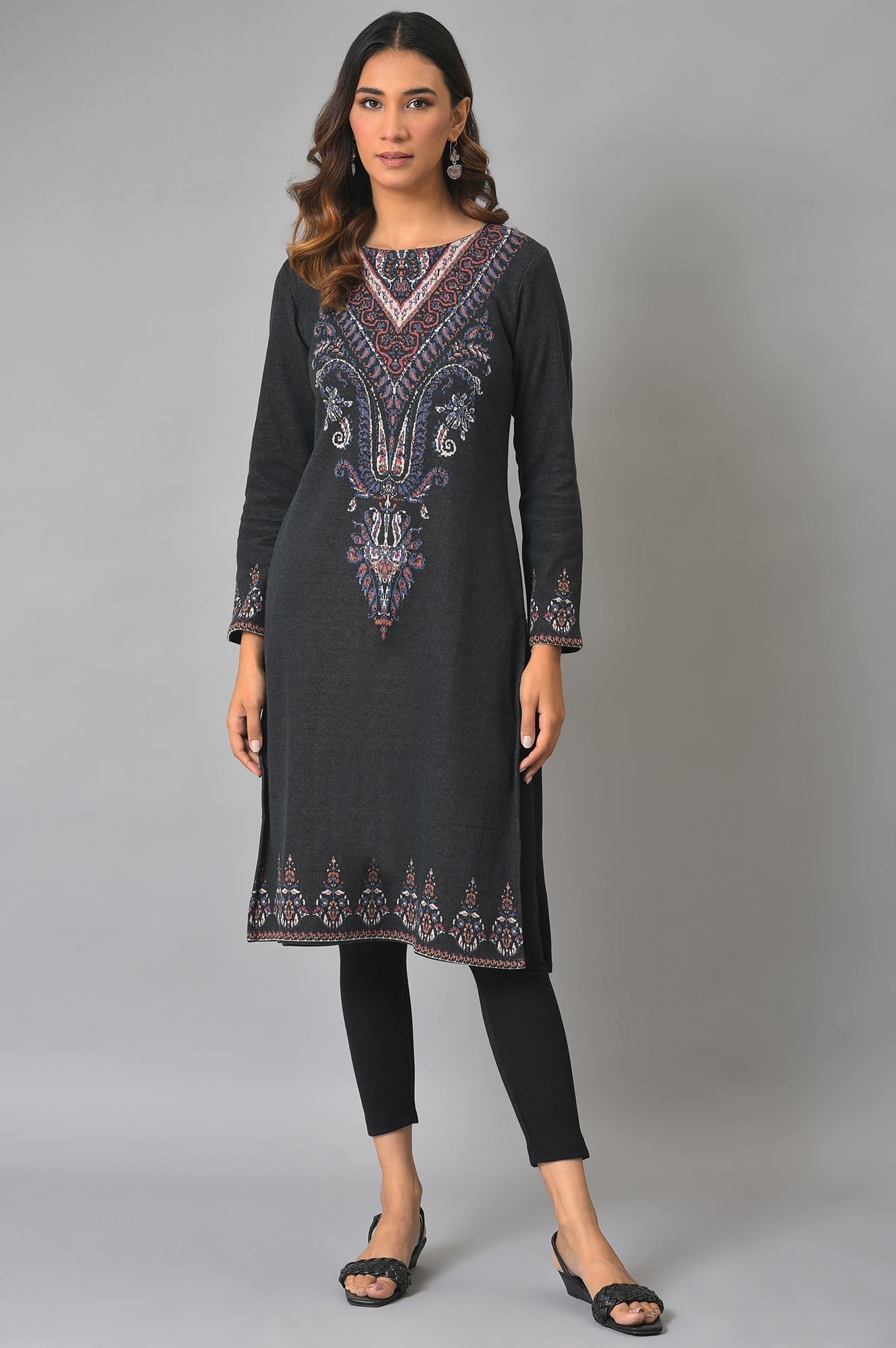 Crafted for effortless style and comfort, these black solid tights are a winter essential. Designed in a skinny-fit silhouette, they feature a mid-rise elasticated waistband for a secure yet flexible fit. The knit fabric adds a touch of warmth and softness, making them perfect for casual outings or cozy indoor days. Pair them with your favorite winter kurtas or tops to create a chic and versatile look. A wardrobe staple that blends functionality with timeless elegance.