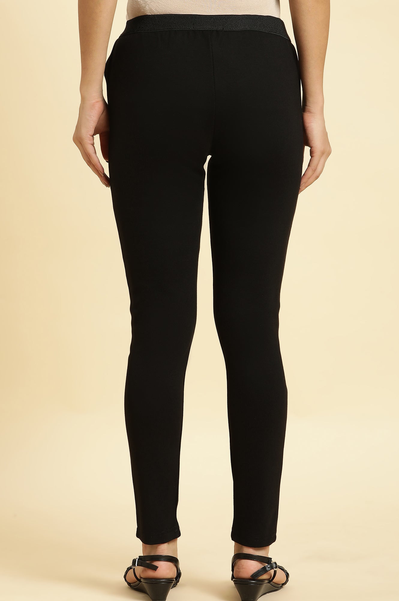 Tailored for versatility! These slim-fit black leggings for women sculpt a sleek mid-rise profile in soft rayon, accentuated by a skinny leg silhouette. The elastic waistband ensures a smooth fit, while the stretchable fabric offers high comfort and flexibility. Perfect for casual outings, workouts, or travel, these leggings pair effortlessly with tank tops and sneakers for a chic look. Designed to move with you, they are a wardrobe essential for every modern woman.