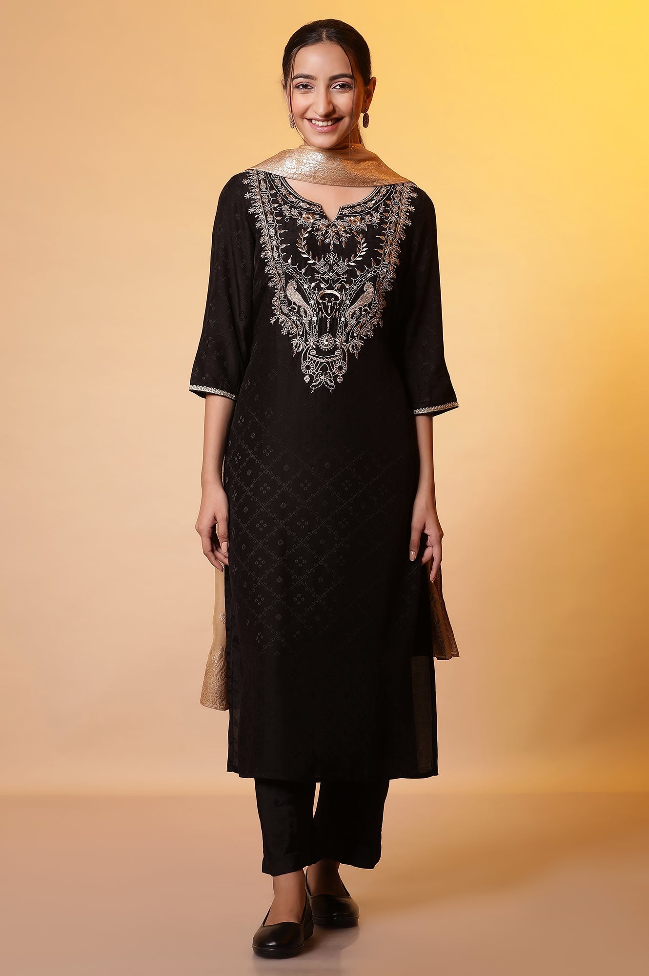 A Straight kurta in exclusively curated texture fabric, adorned with Golden zari embroidery. It is paired with matching bottom and a complimenting jacquard dupatta with beautiful bird motifs.