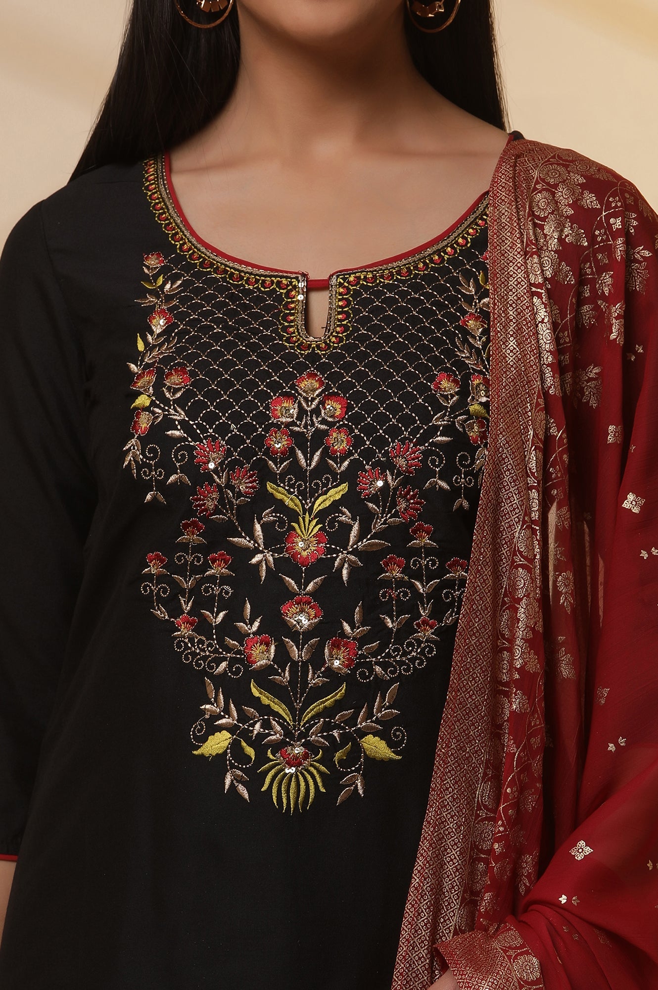 Black Zari Embroidered Straight Kurta, Red Printed Skirt and Dupatta Set