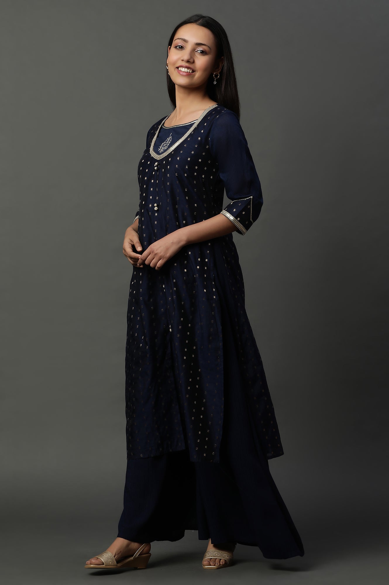Blue A-line Jacquard Kurta, Palazzos and Dupatta Set