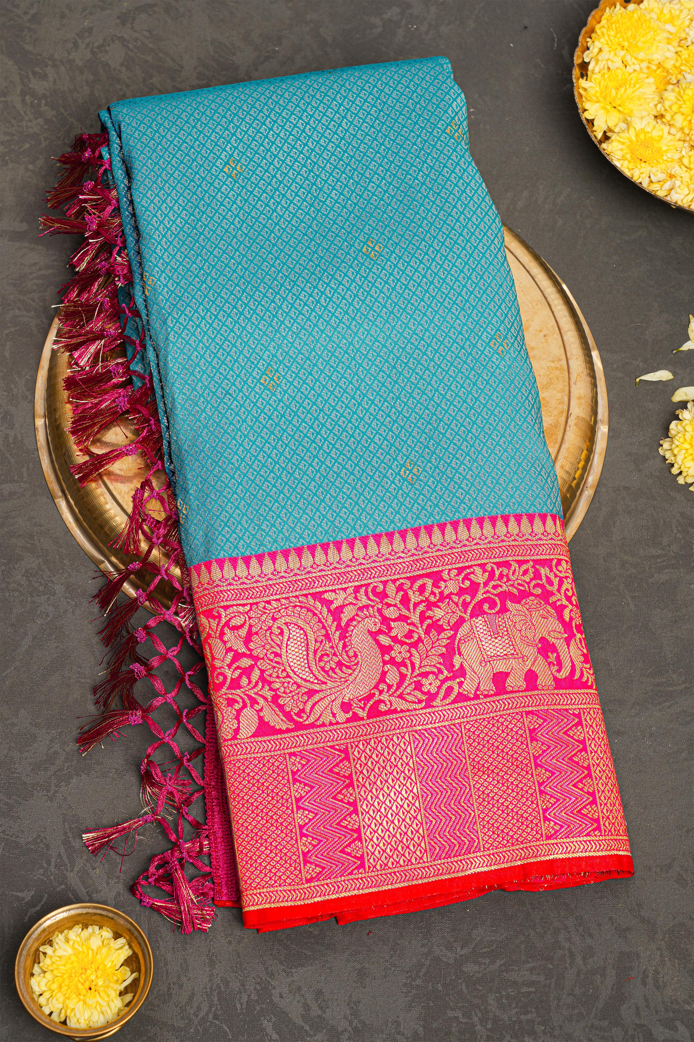 Latest BLUE BROCADE SILK Saree with CONTRAST ZARI border. This saree comes with CONTRAST WITH BORDER SILK blouse.