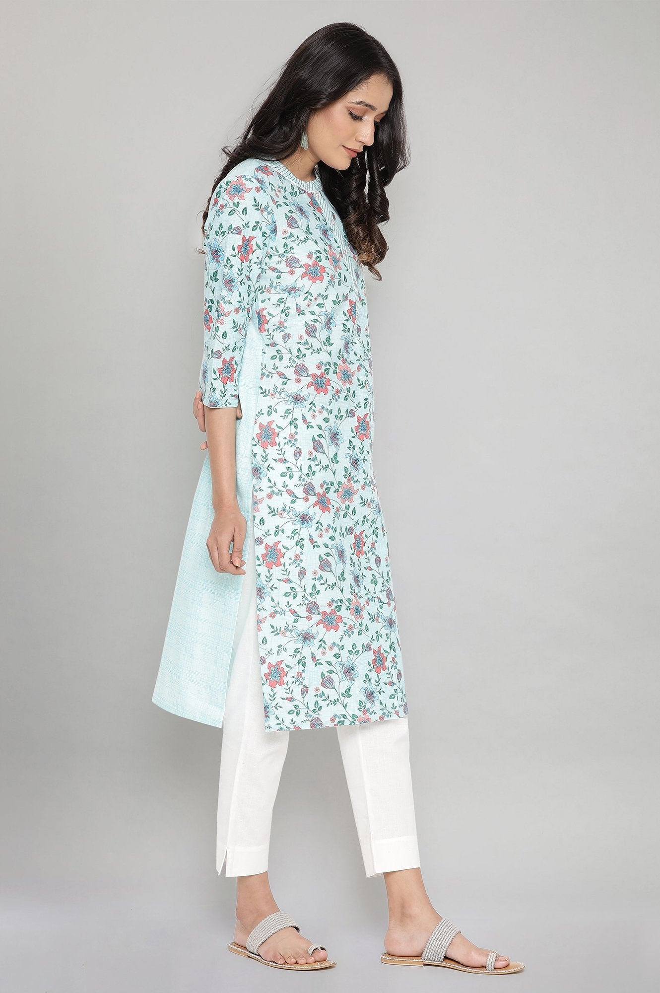 Simple yet chic! This floral print ocean wave kurta in round neck with button placket kurta has staright silhouette, side slits and three-quarter sleeves. Amph up your casual wardrobe with this pretty and comfortable kurta. You can style it for a casual day out, at office or while traveling.