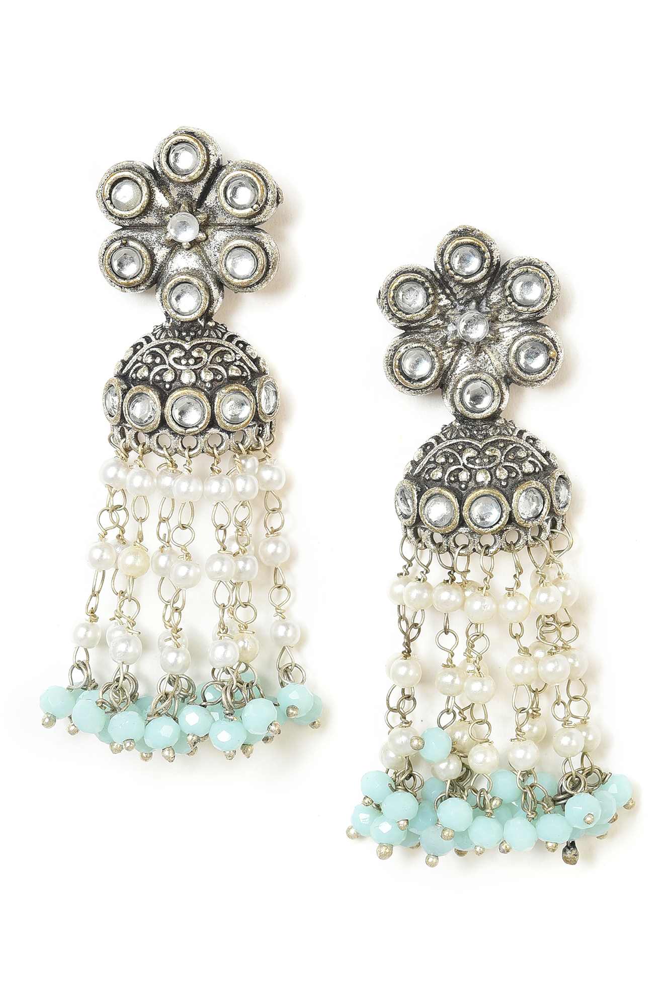 Traditional Silver Oxidised Lariat Necklace Set With Faux Kundan And Blue Crsytal Beads Detailing