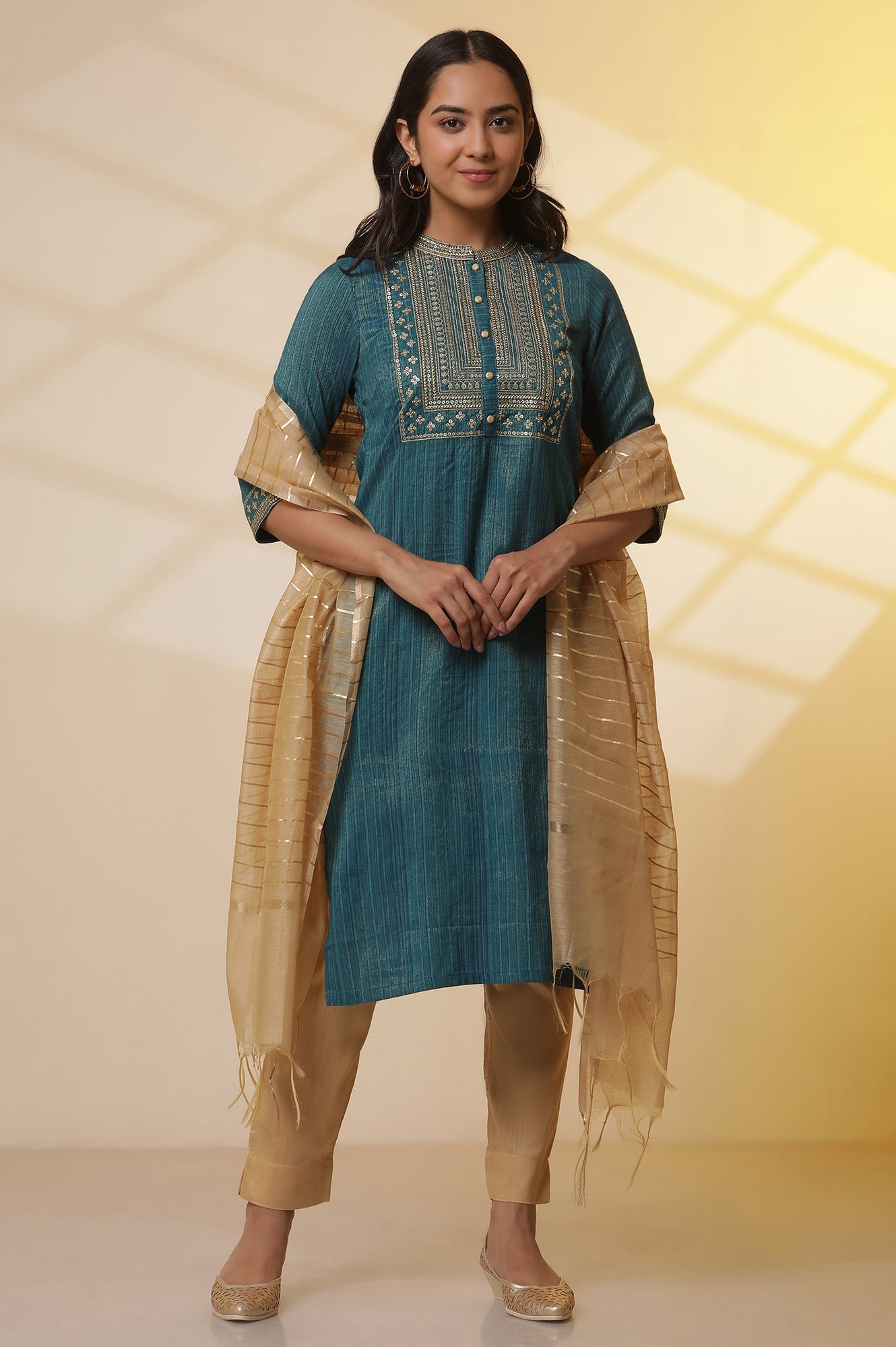 Blue Embellished Lurex Stripes Kurta, Trousers and Dupatta Set