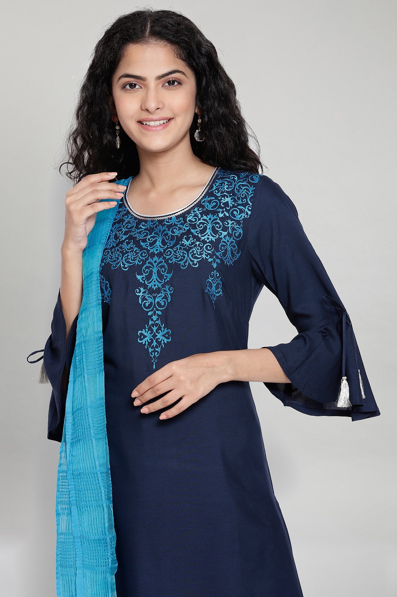Blue round neck kurta having three-quarter sleeves and thread embroidery at front. Paired with solid blue trousers and dupatta.