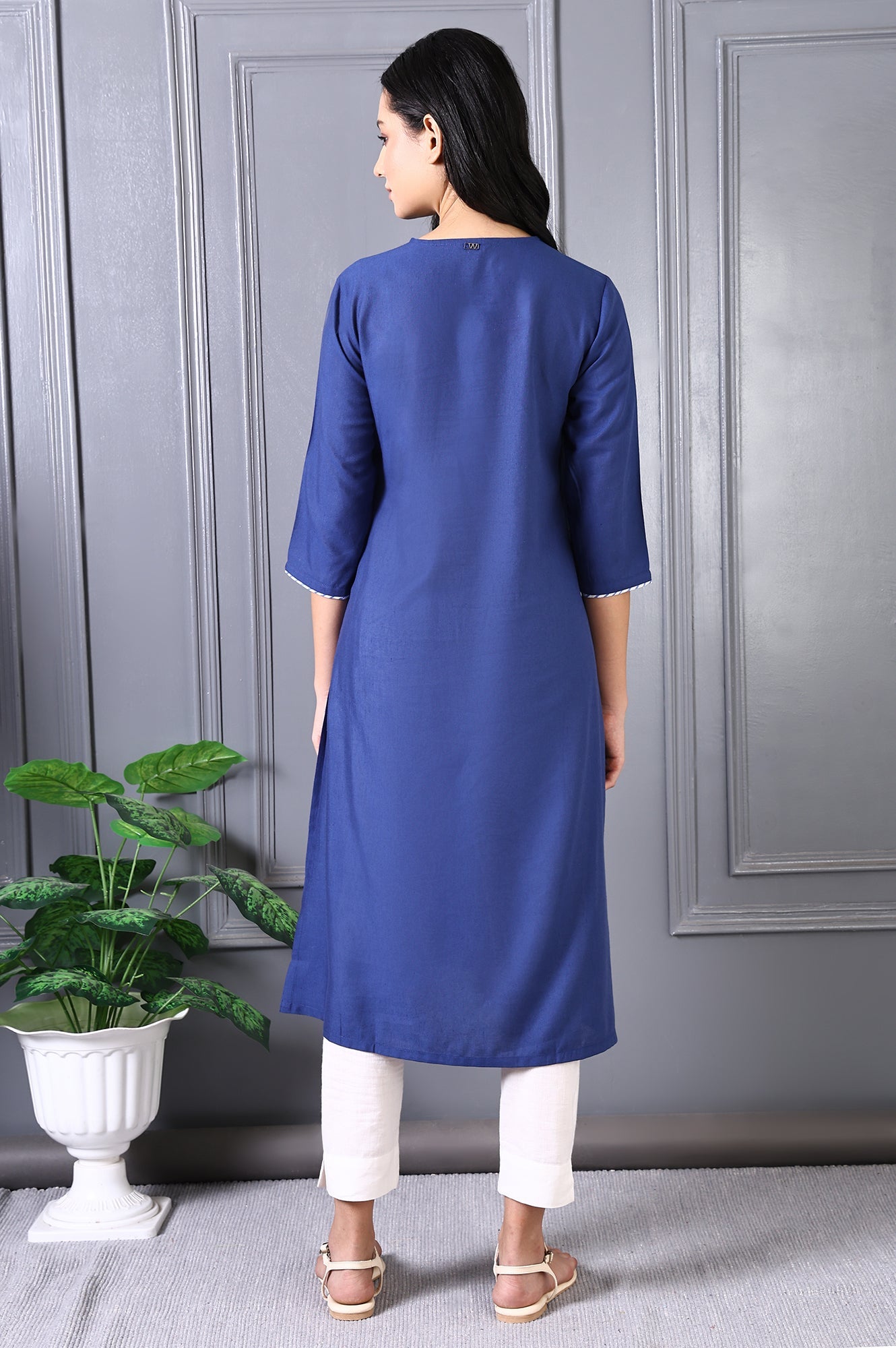 Crafted in soft rayon flax, this blue A-line kurta combines the richness of thread embroidery with delicate print work. The silhouette flatters with its slightly flared cut, making it a versatile choice for casual gatherings and semi-formal settings. Thread embroidery along the neckline and front panel creates an artisanal look, while the overall print adds depth and visual interest. The rayon flax fabric ensures a smooth finish and lightweight wearability, ideal for warm days or transitional weather. With its deep blue base, this kurta makes a quiet yet confident statement for everyday ethnic dressing or workwear with a polished twist.