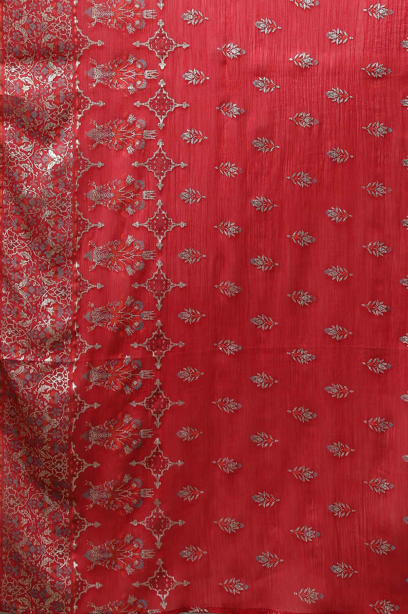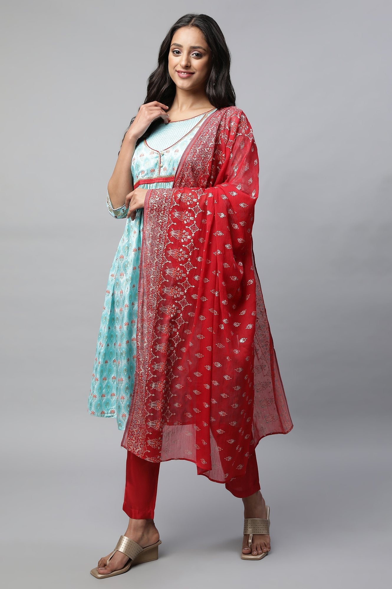 Flaunt Your Stylish Look In This Chic Aurelia Set. The Set Includes Blue Floral Printed kurta In Cuff Sleeves. It Is Paired With Red Trousers And Printed Dupatta.