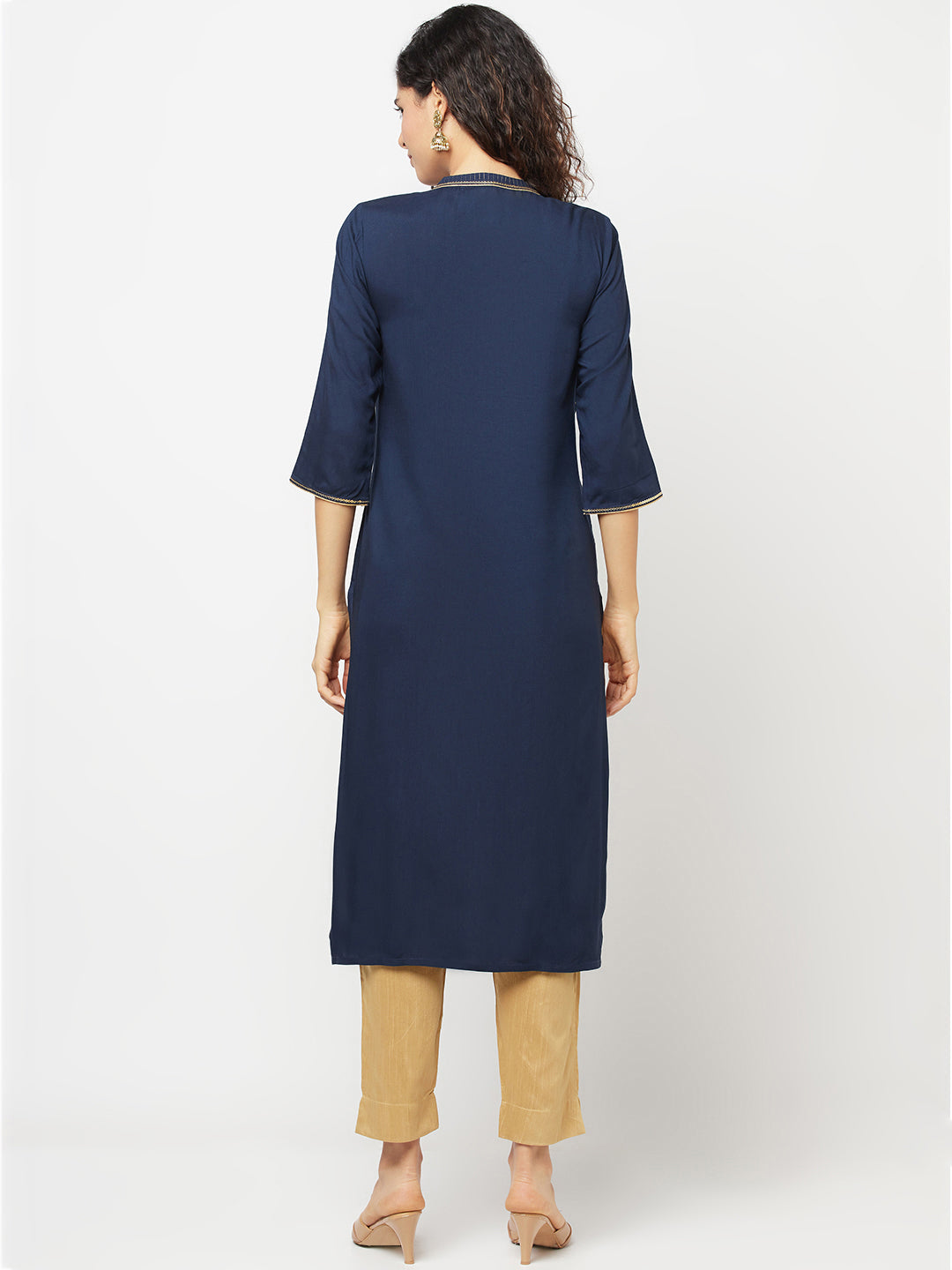 Get styled for the light festive event in this stunning set. The set has blue printed kurta round neck with button closure. It is paired with gold trouser pants.