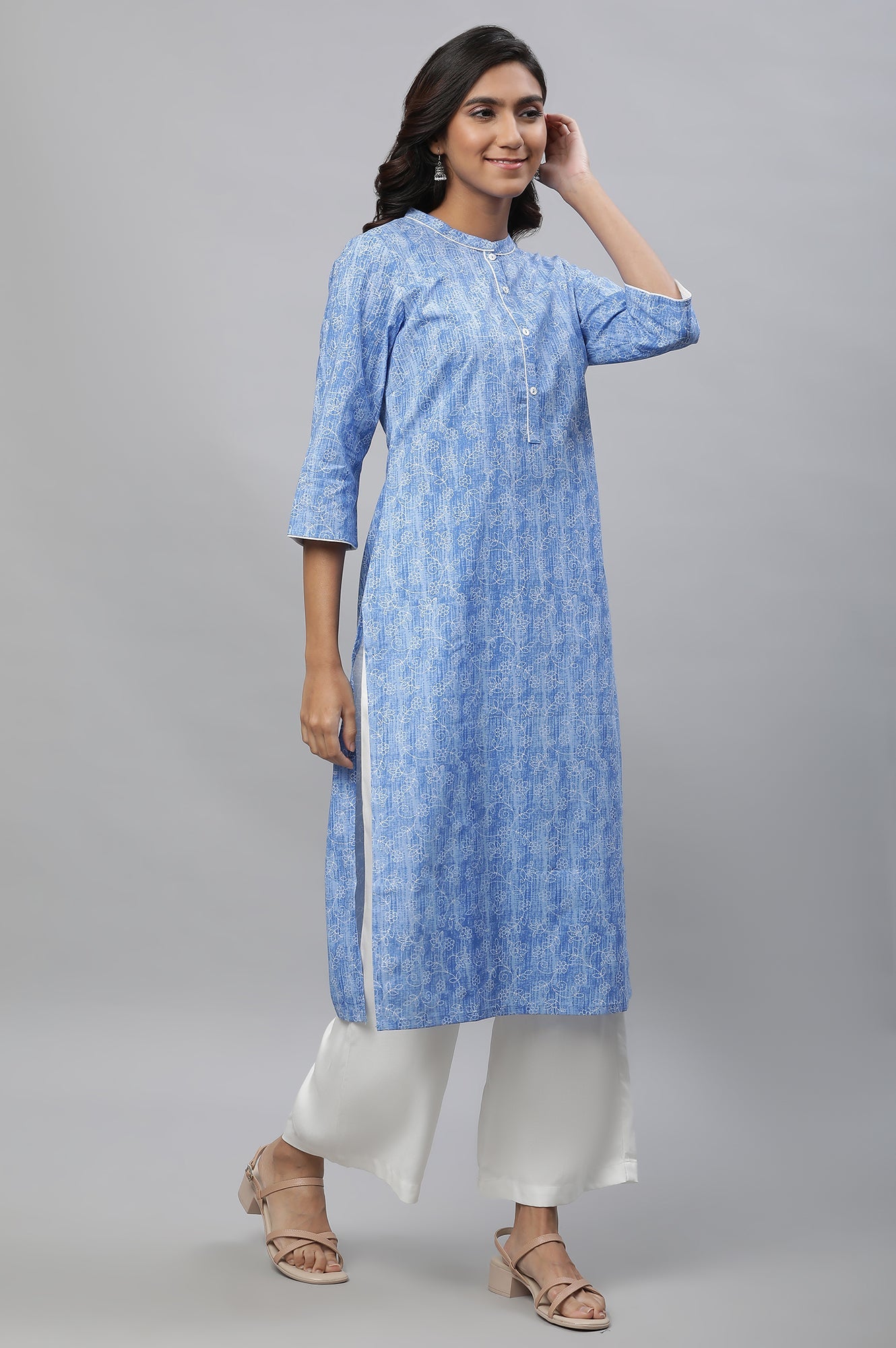 A fresh, monochromatic floral kantha printed straight kurta with smart mandrin neckline detail with placket highlighted contrast piping. This gives you a space to choose from variety of bottoms in contrast.