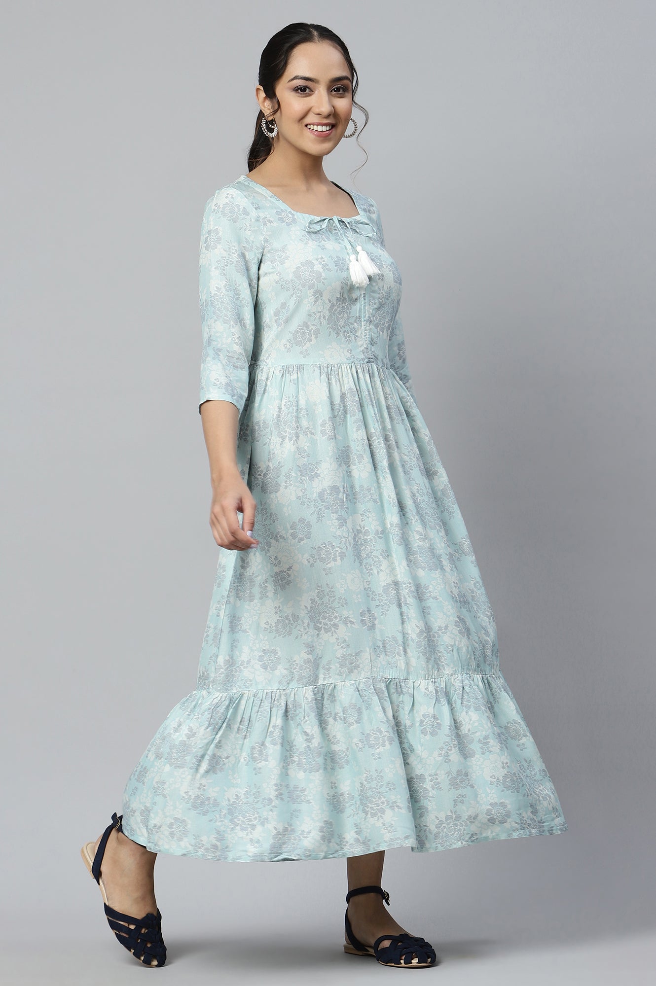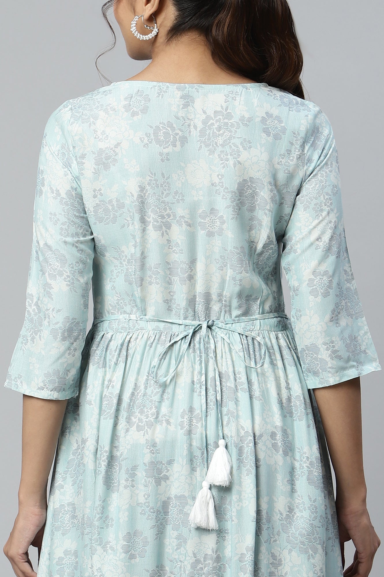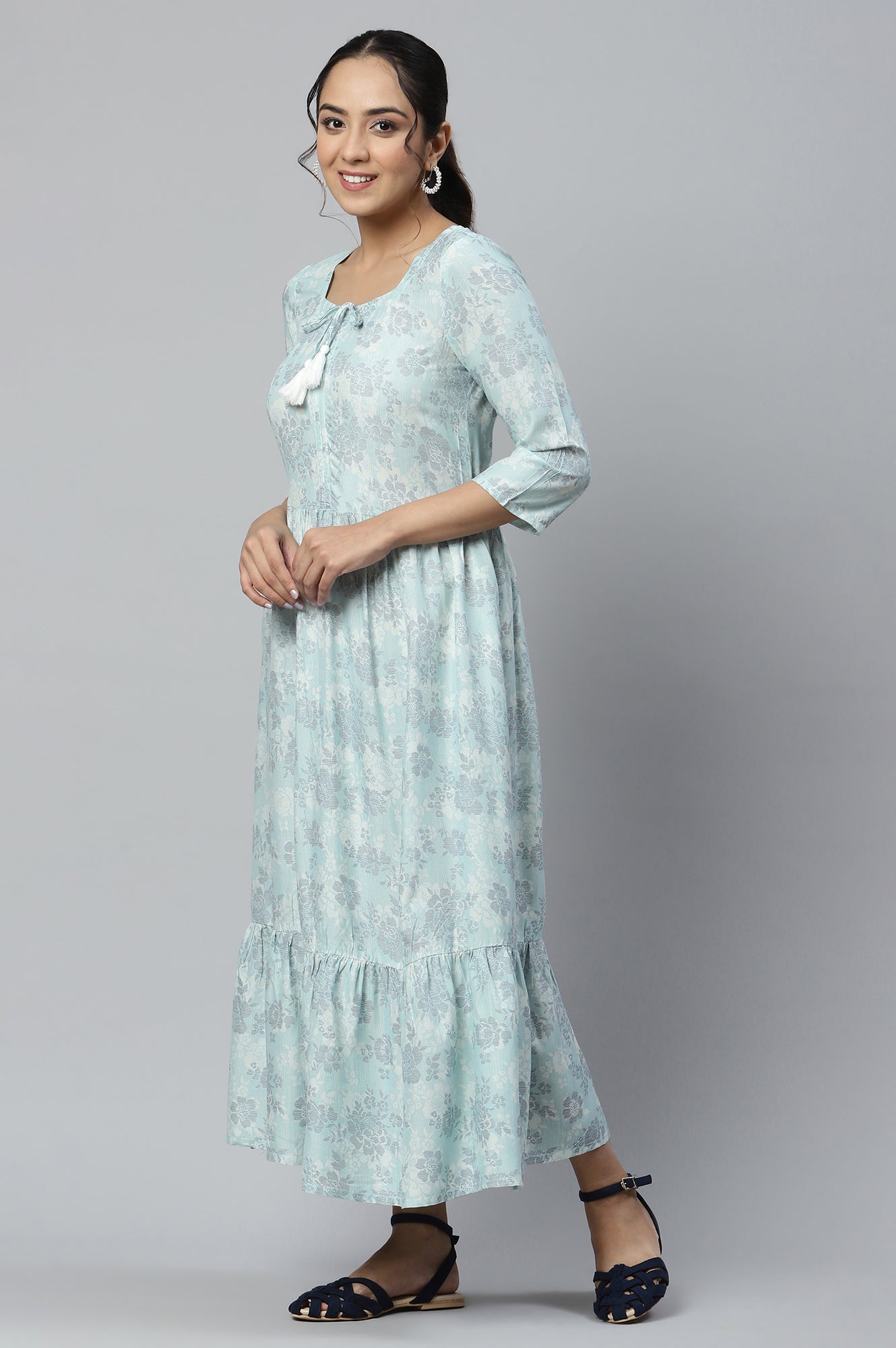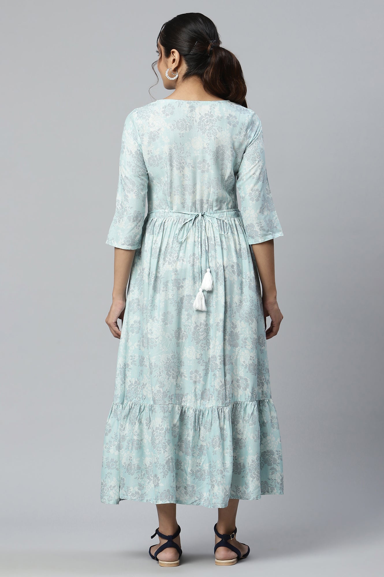 Easy like a Sunday morning, this rayon midi-dress comes with fixed soft gathers at the centre front and a tie up detail with white tassels. With a flattering silhouette and it's pacifying blue hues, this is a transitional piece that you can wear all around the year.