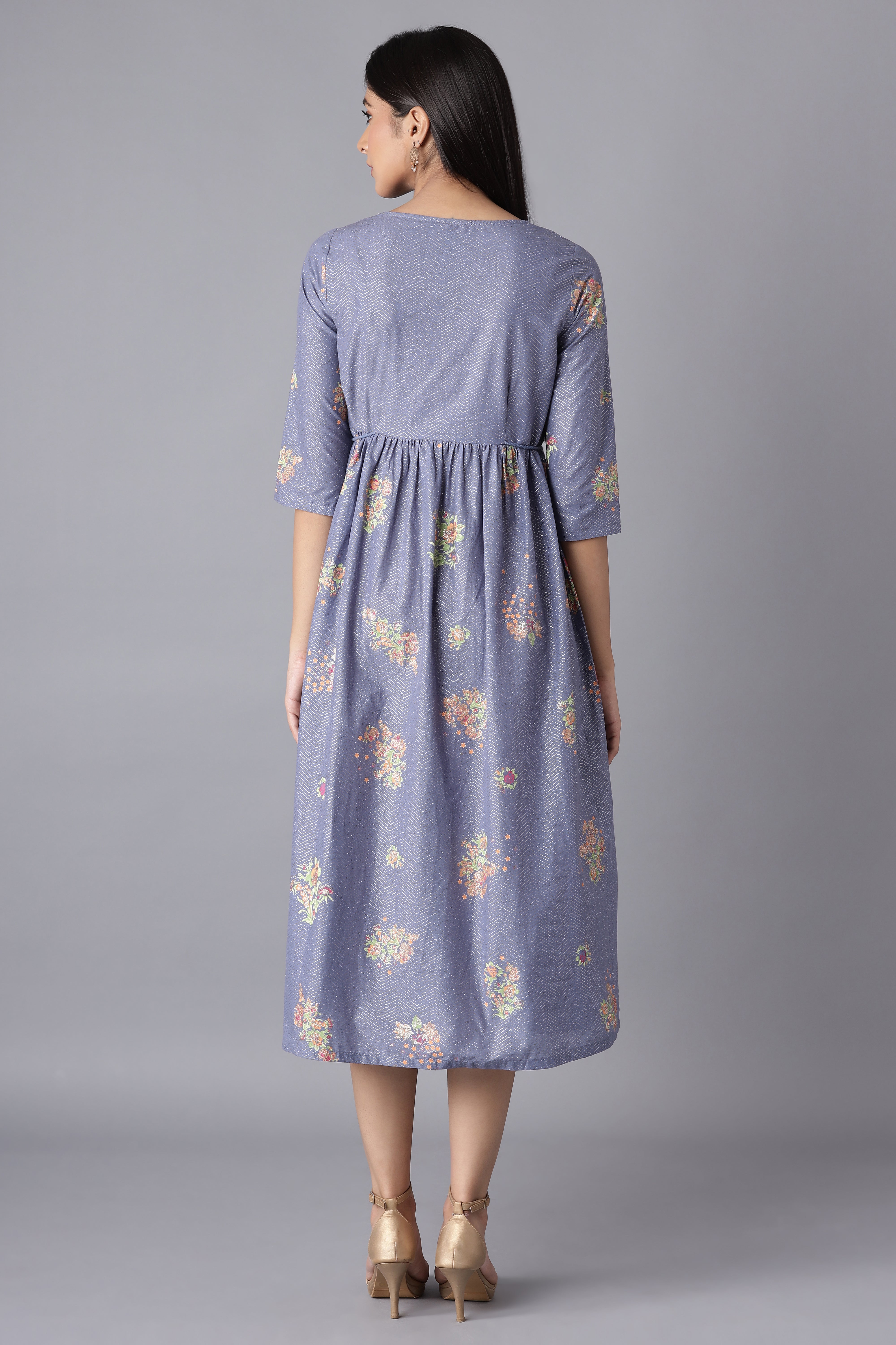 Cornflower blue gathered indo-western dress in floral print. It has round neck and three-quarter sleeves and tie-up detail.