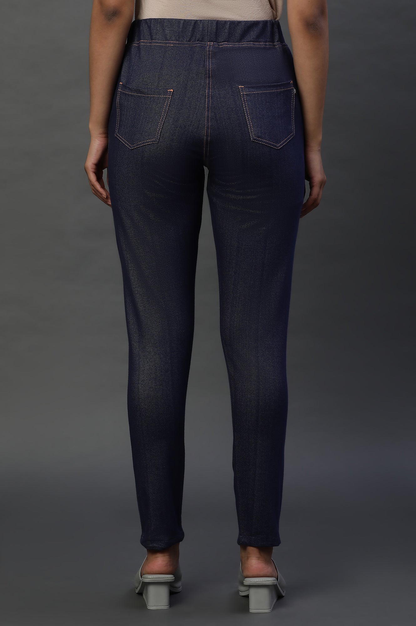 These twill knit jeggings offer a flattering fit, provides great stretchability for easy movement and adds comfort while wearing. With four pockets, and contrast stitch lines, it gives a modern and trendy look, making it a versatile piece in any wardrobe."