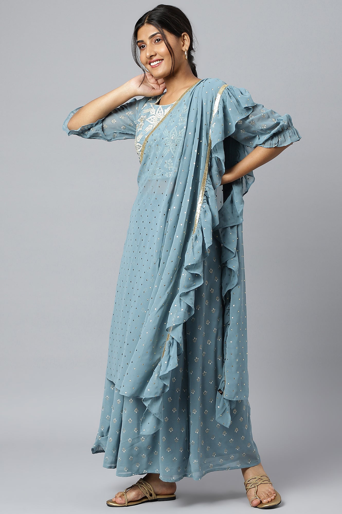 Make heads turn at any occasion in this fashionable blue mist 3d embroidered crop top and Semi Flare Palazzos. It has a pre stitched saree drape which looks very gorgeous when worn and is super comfortable to wear. It is a must have this season and is sure to earn you compliments.