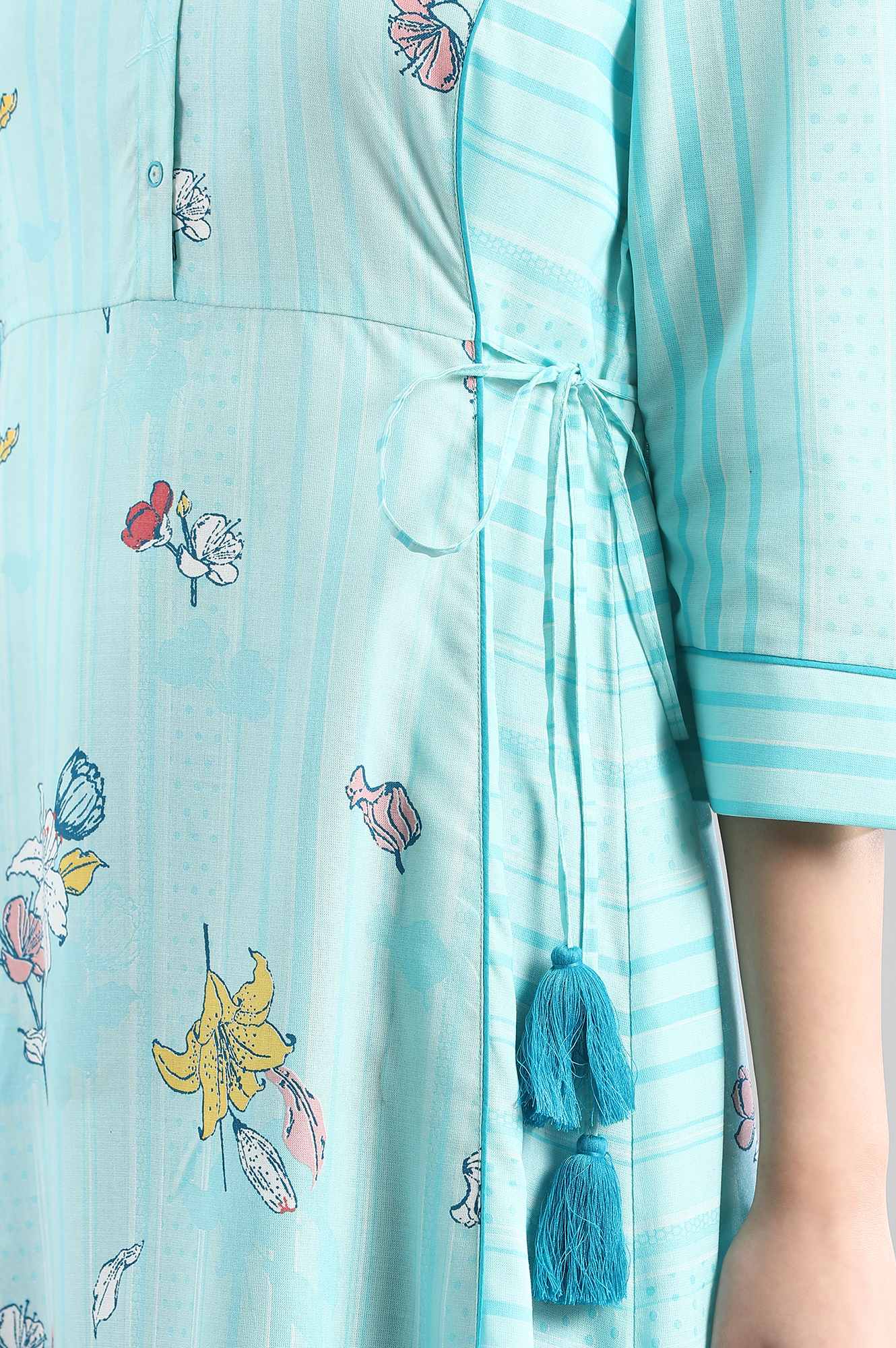 Blue printed A-line kurta in band with V neck and three-quarter sleeves with tassel tie-up.