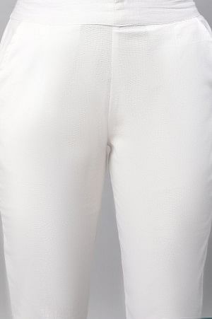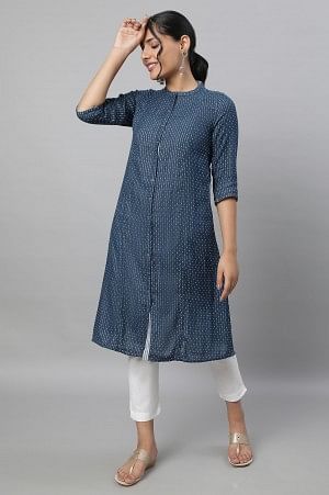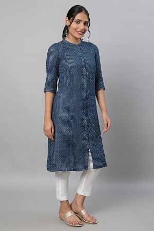 Slide into a smart set this season for an effortless look. The set has blue geometric print cotton kurta. This kurta features down button closure and it is reversible which allows you to wear it either ways. It comes with white solid trouser pants which has two side pockets.