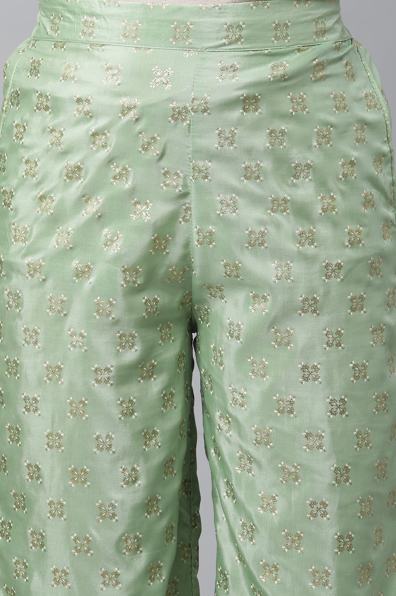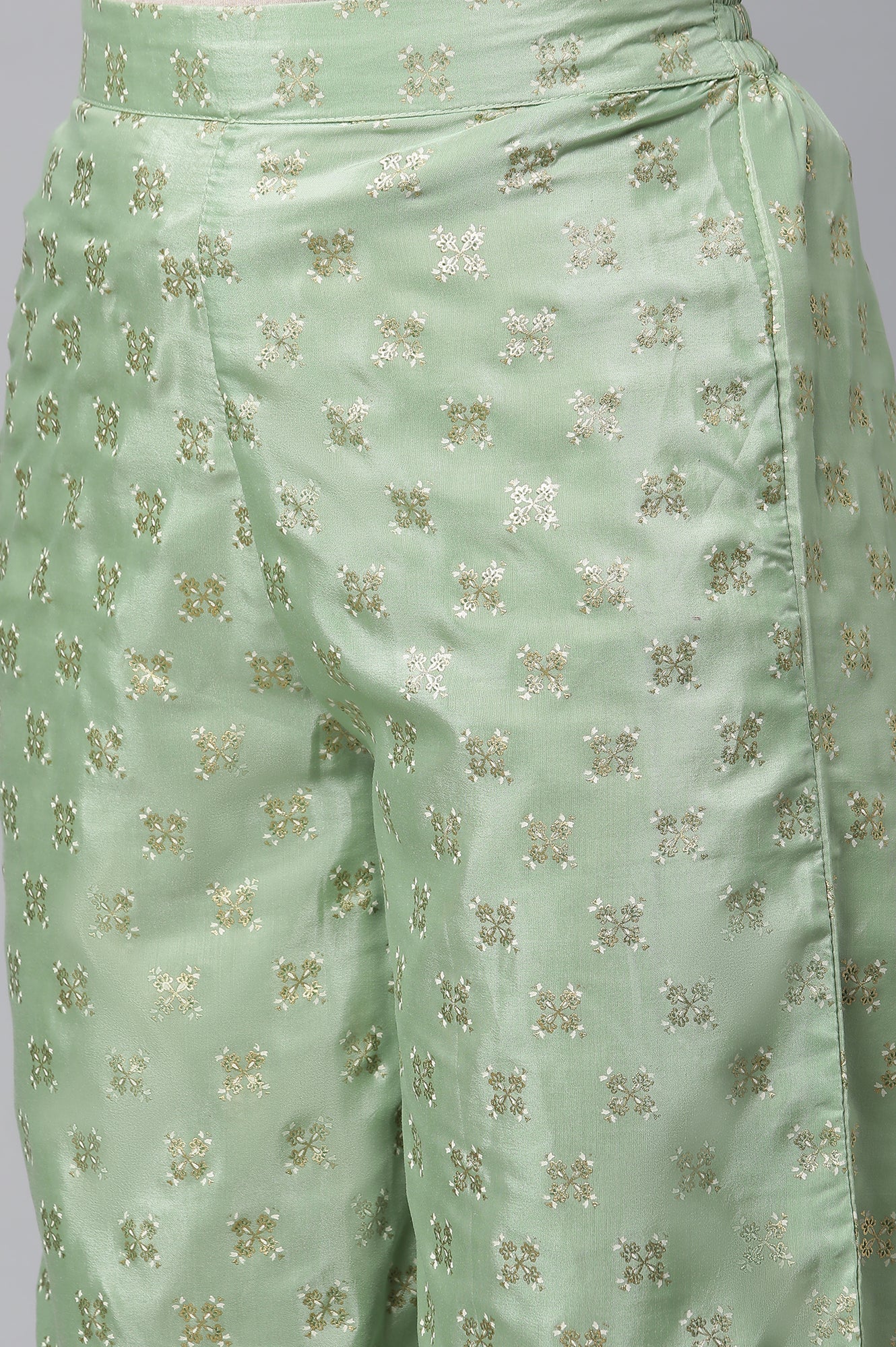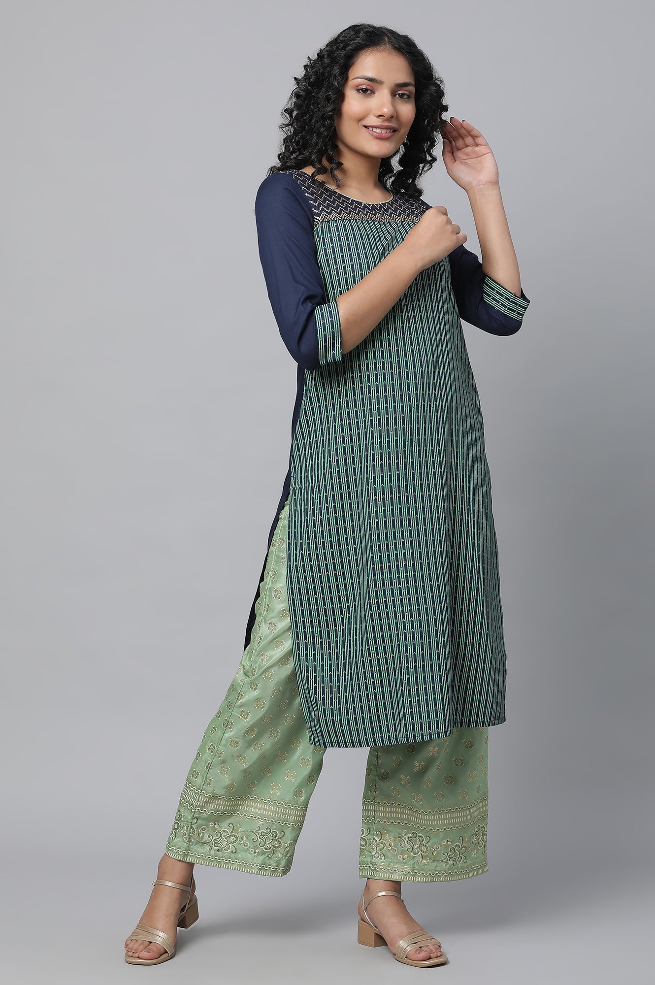 Lift Up Your Casual Look With This Stylish kurta Set. The Set Includes Blue Colour Block Printed Liva kurta In Round Neck And Straight Silhouette. It Is Paired With Green Printed Straight Palazzo Pants.