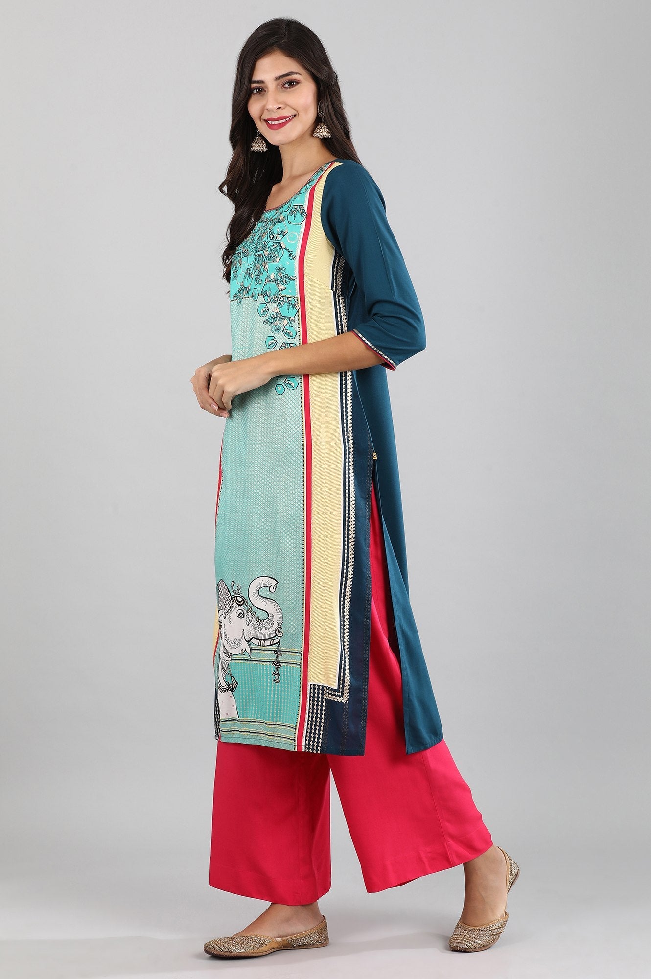 Blue round neck straight Liva kurta with animal print detail.