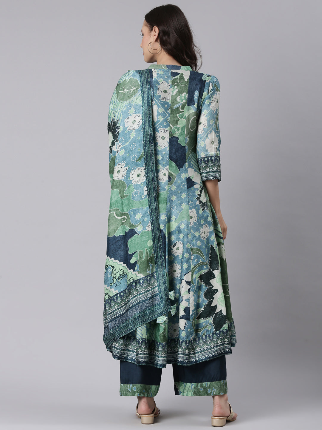 Blue Silk printed anarkali with palazzo three piece set
