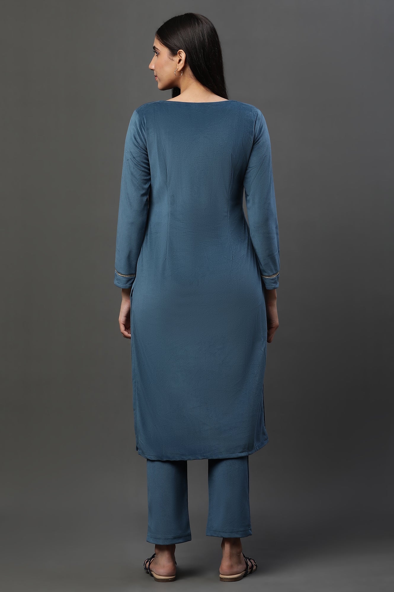 Blue Zari Embroidered Velvet Kurta and Pants Set