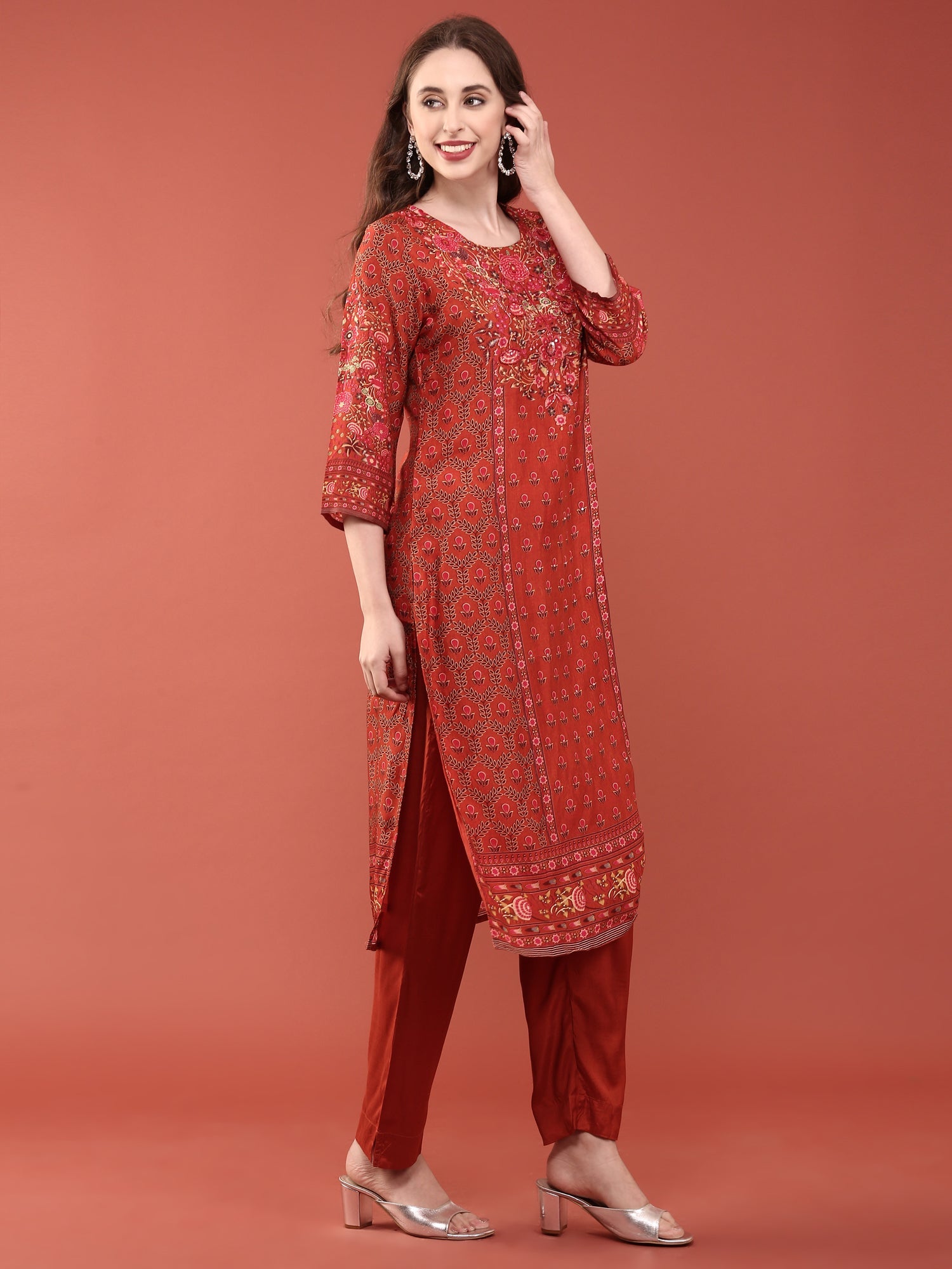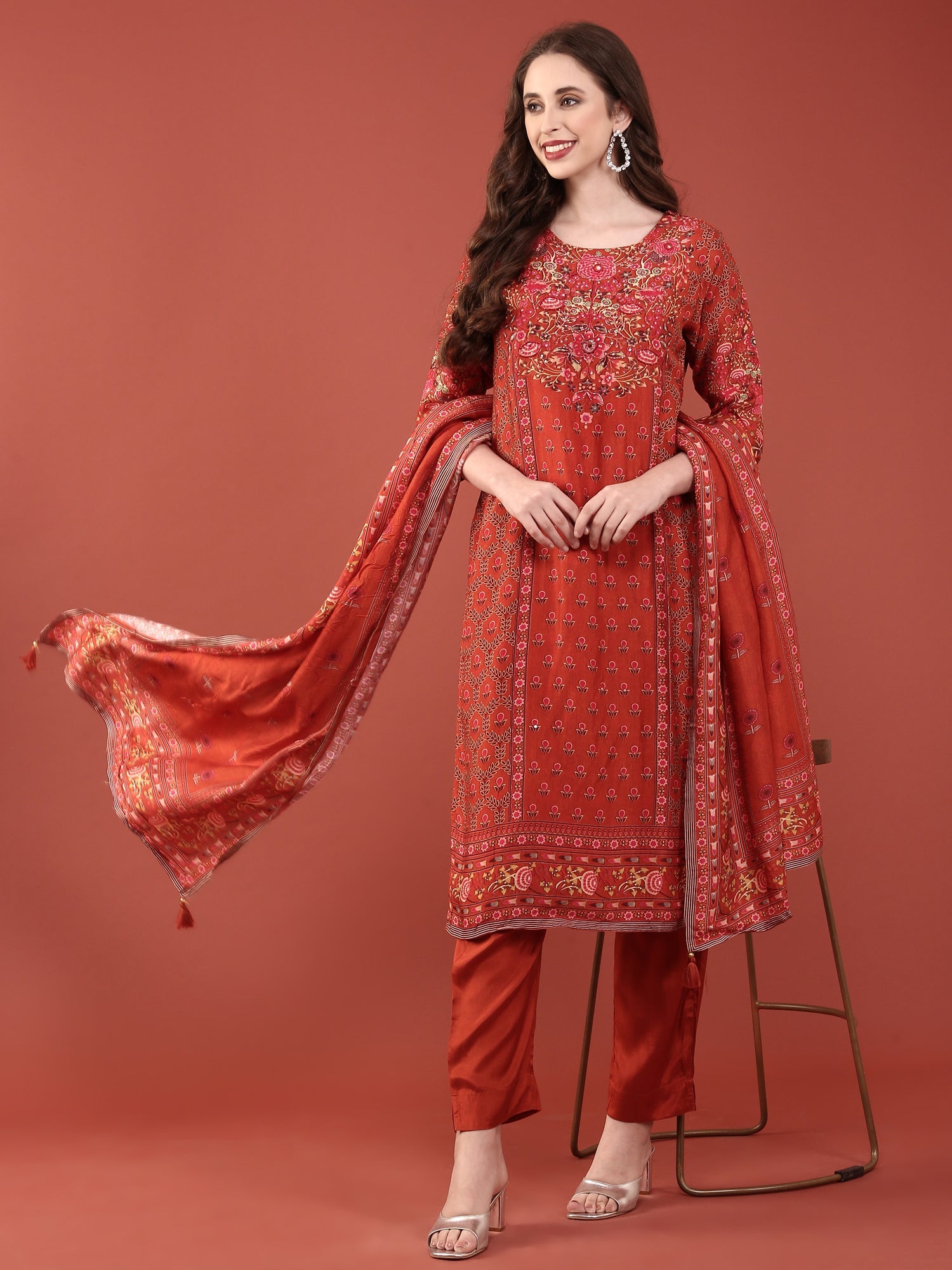 Elevate your ethnic wardrobe with this striking three-piece ensemble crafted from premium dola silk. The blunt orange hue creates a bold, sophisticated statement, while the digital print adds contemporary flair to traditional silhouettes. This versatile set seamlessly transitions from festive occasions to everyday elegance, offering comfort without compromising on style.