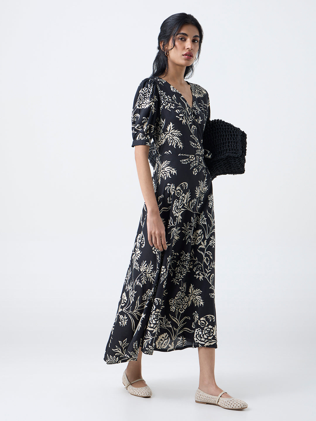 Bombay Paisley introduces a foliage-printed black dress designed for movement, charm and a touch of wanderlust. The V-neckline flows into a wrap-style bodice with a tie-up waist that creates a flattering, cinched shape. Puff sleeves add a feminine airiness, making this dress ideal for holiday strolls, brunch dates or relaxed festive gatherings.