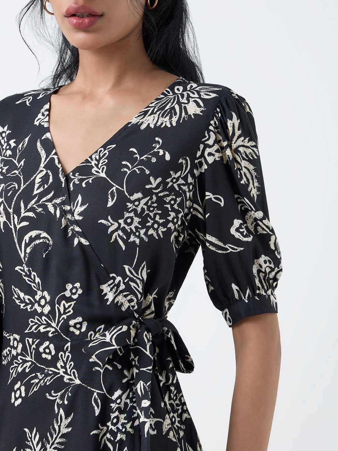 Bombay Paisley Black Foliage Pattern Wrap-Style Dress