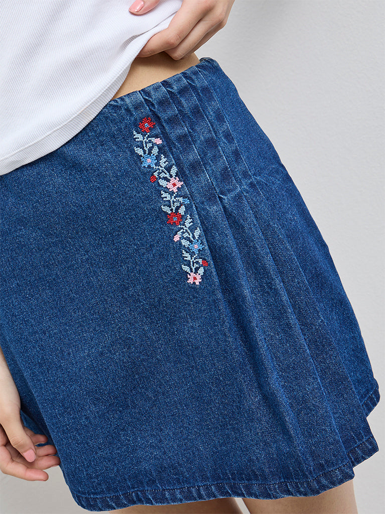 Bombay Paisley presents this blue skirt crafted from pure cotton for a light, breathable feel. Designed with built-in shorts for added comfort and coverage, it features subtle floral embroidery and gentle pleat detailing. A single side pocket adds a functional touch, while a side zip closure ensures a clean, flattering fit.