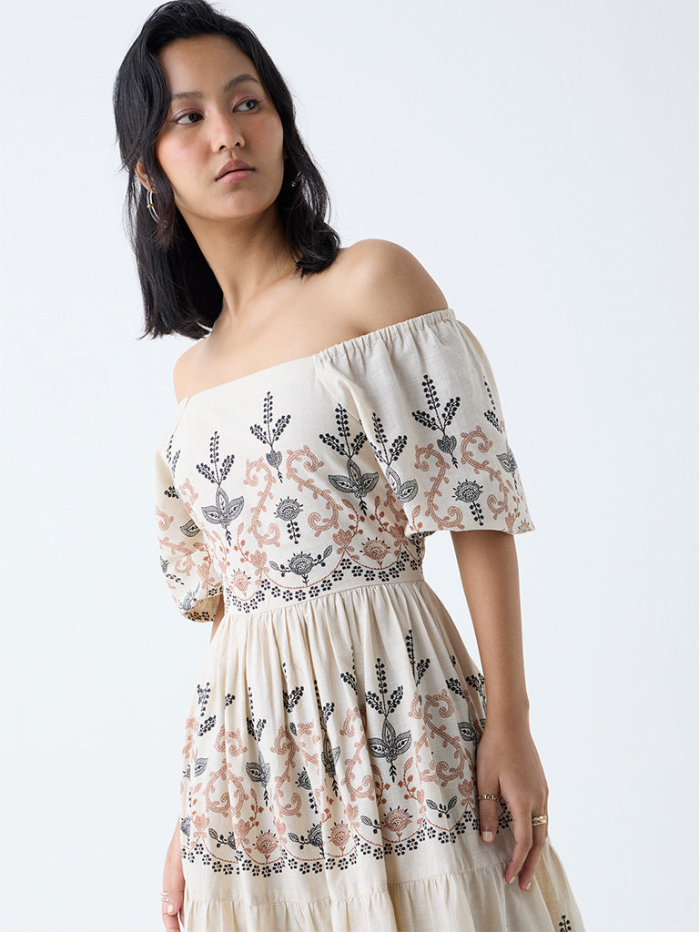 Bombay Paisley Off-White Foliage Cotton Off-Shoulder Dress