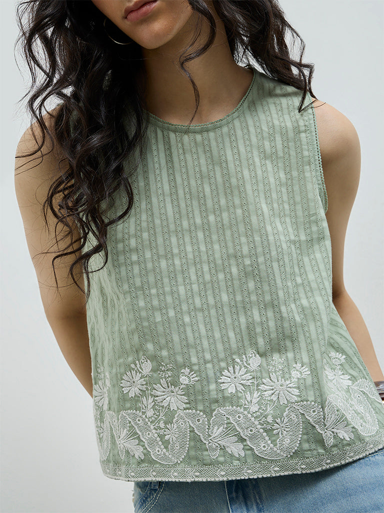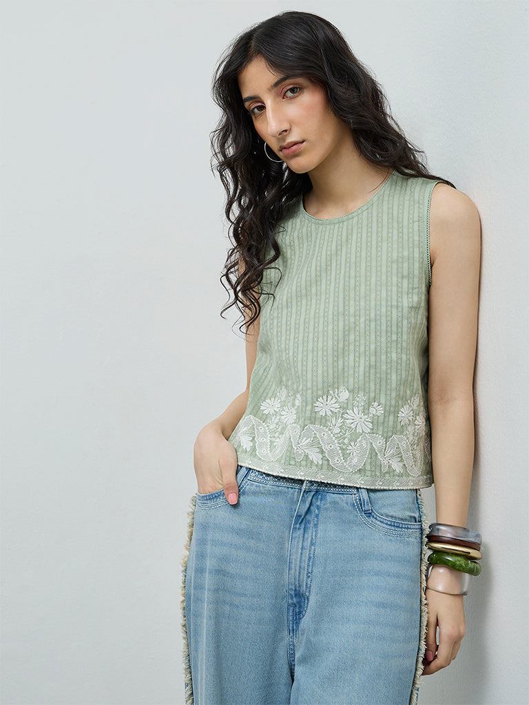 Soften your everyday wardrobe with this sage top from Bombay Paisley, decorated with delicate embroidered accents for subtle texture. Crafted from a cotton-rich fabric, it is designed with a round neckline and sleeveless cut, offering timeless appeal and all-day comfort.