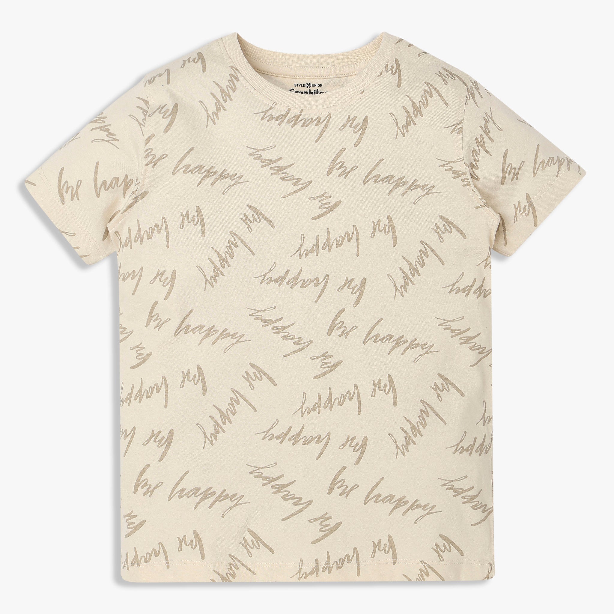 Introducing the Boy's Cotton Crew Neck Graphitee T-Shirt, a perfect blend of comfort and style for active boys. Crafted from soft cotton, this T-shirt features a vibrant all-over print that adds a fun touch to any outfit.