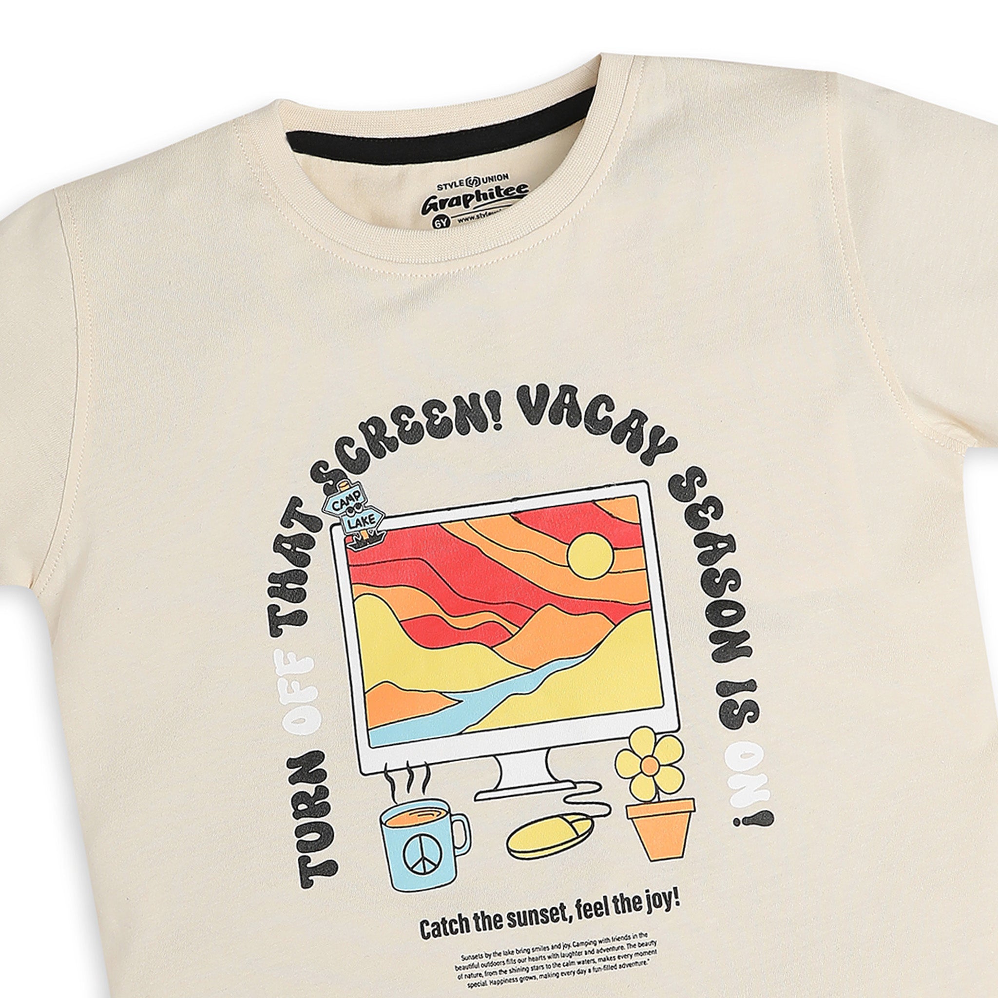 These graphic pattern t-shirt has crew neck and half sleeve. Made from cotton, your kid's feel comfortable wearing the product.