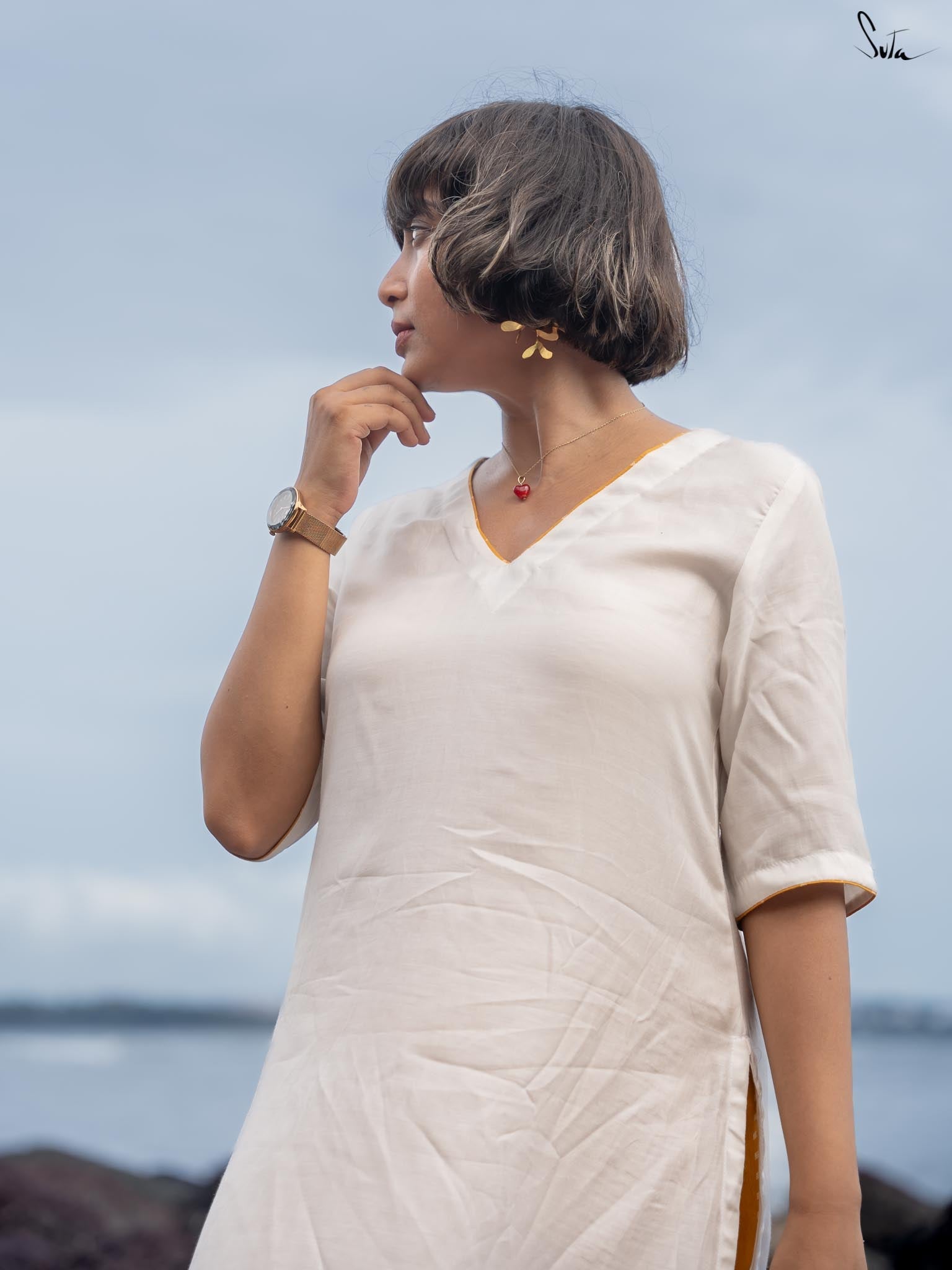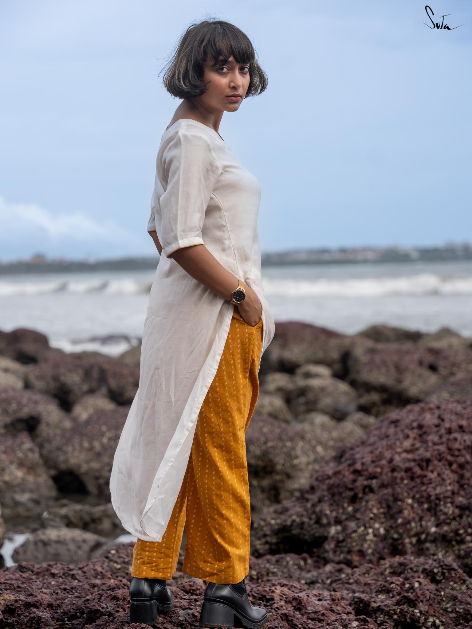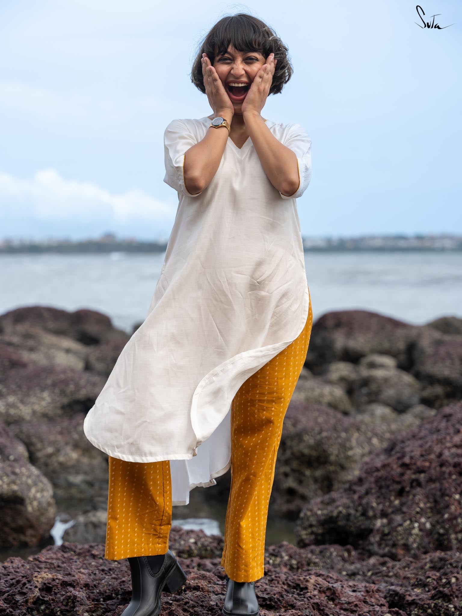 Radiate sunshine vibes with Bright Bliss, a co-ord set that brings together a crisp white top and vibrant yellow striped pants. The V-neckline and pockets add a playful twist. Perfect for casual meet-ups. Style the co-ord set with sneakers and sunnies for a breezy look.