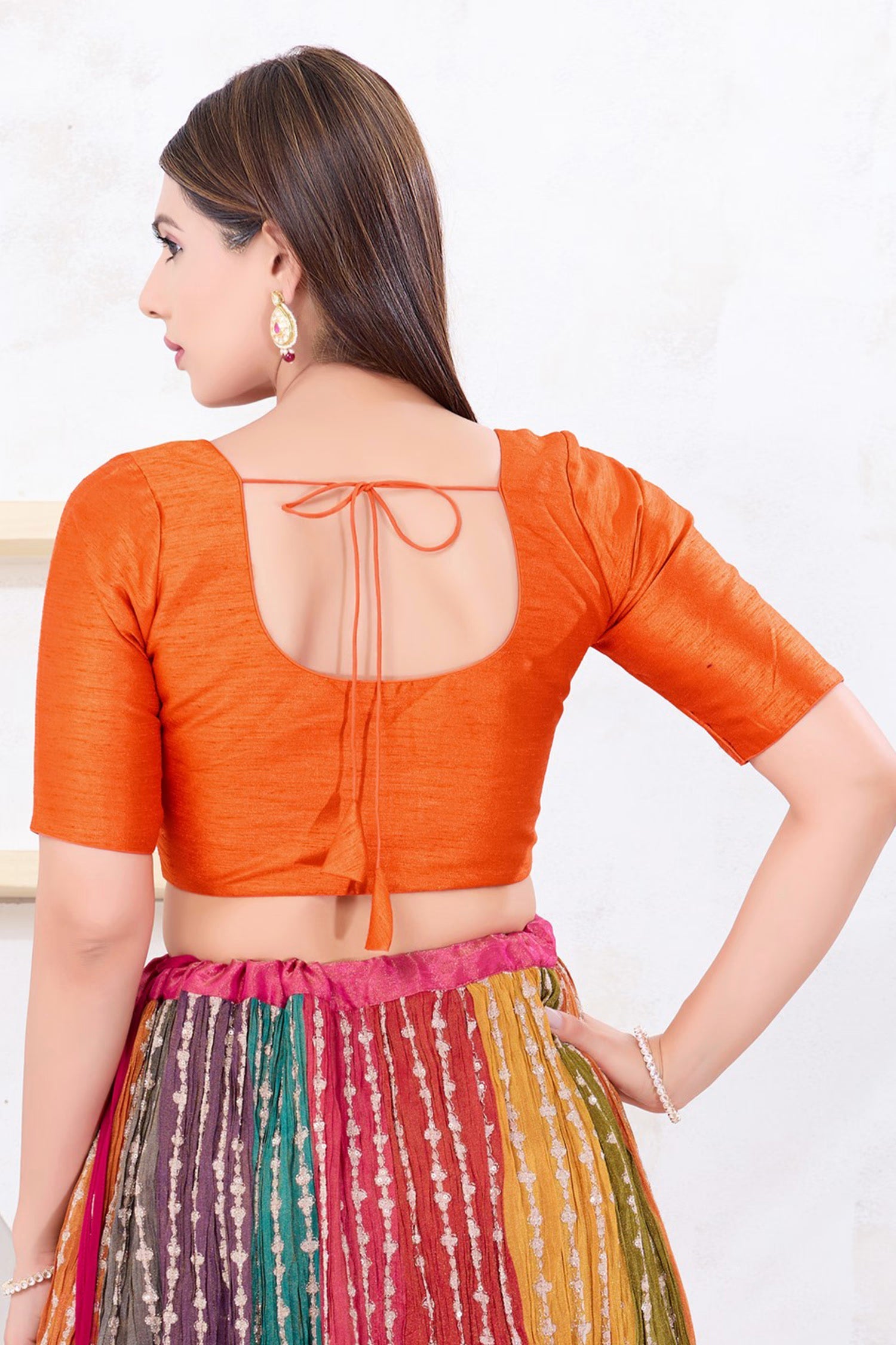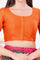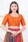 The bright orange solid dupion silk blouse with elbow length sleeves for a neat traditional look.