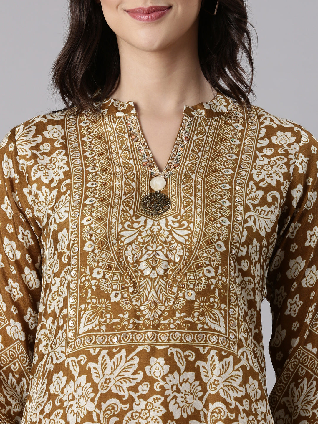 Brown Muslin Printed Three Piece Set