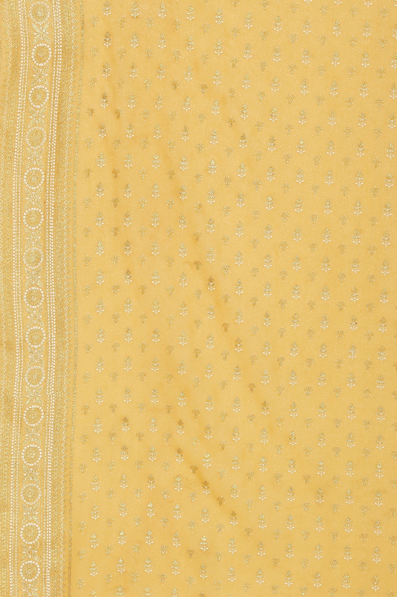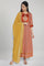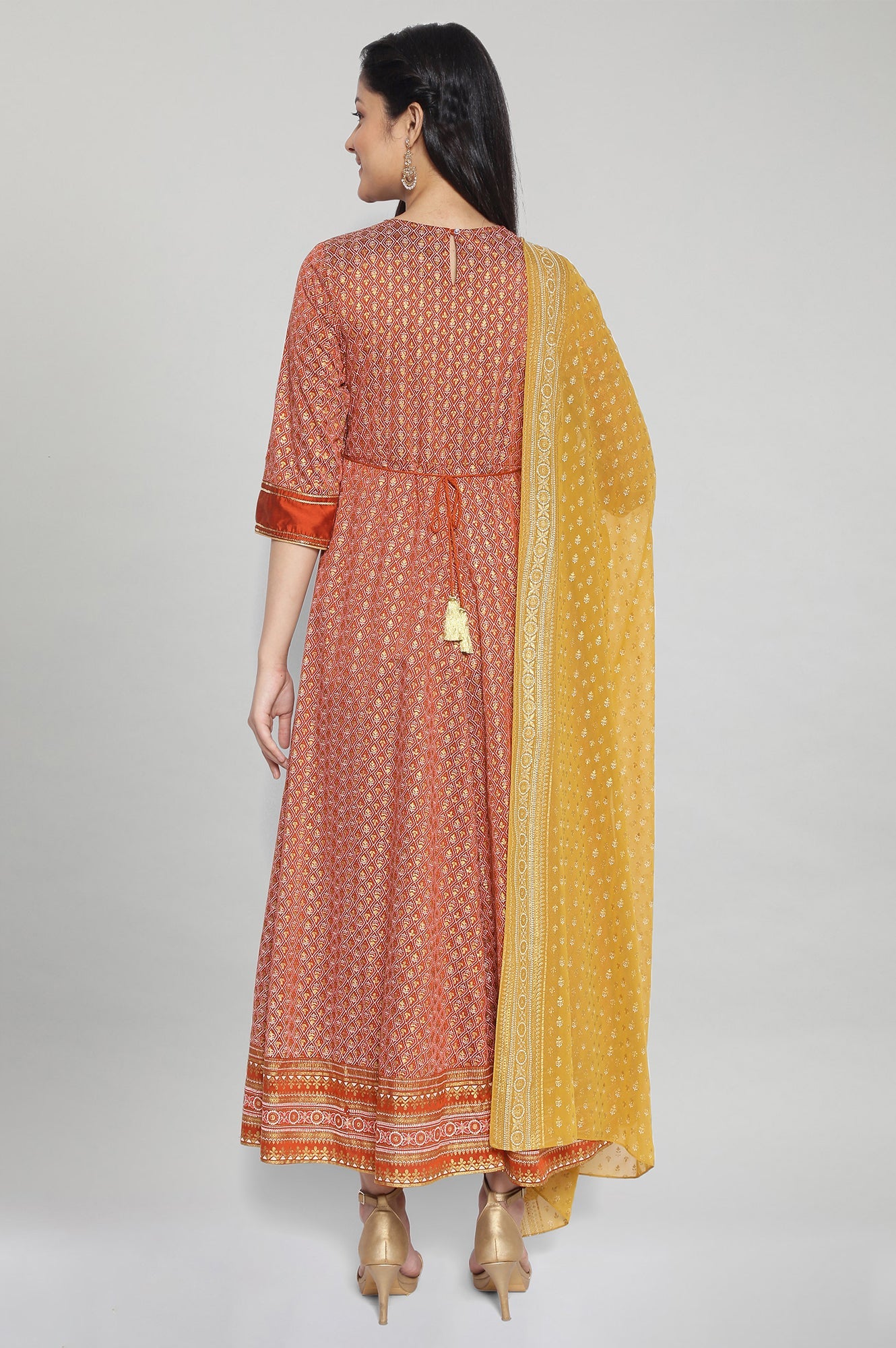 Terracotta Brown round neck dress having three-fourth, printed and sequinned detail. Paired with a dark golden printed dupatta.