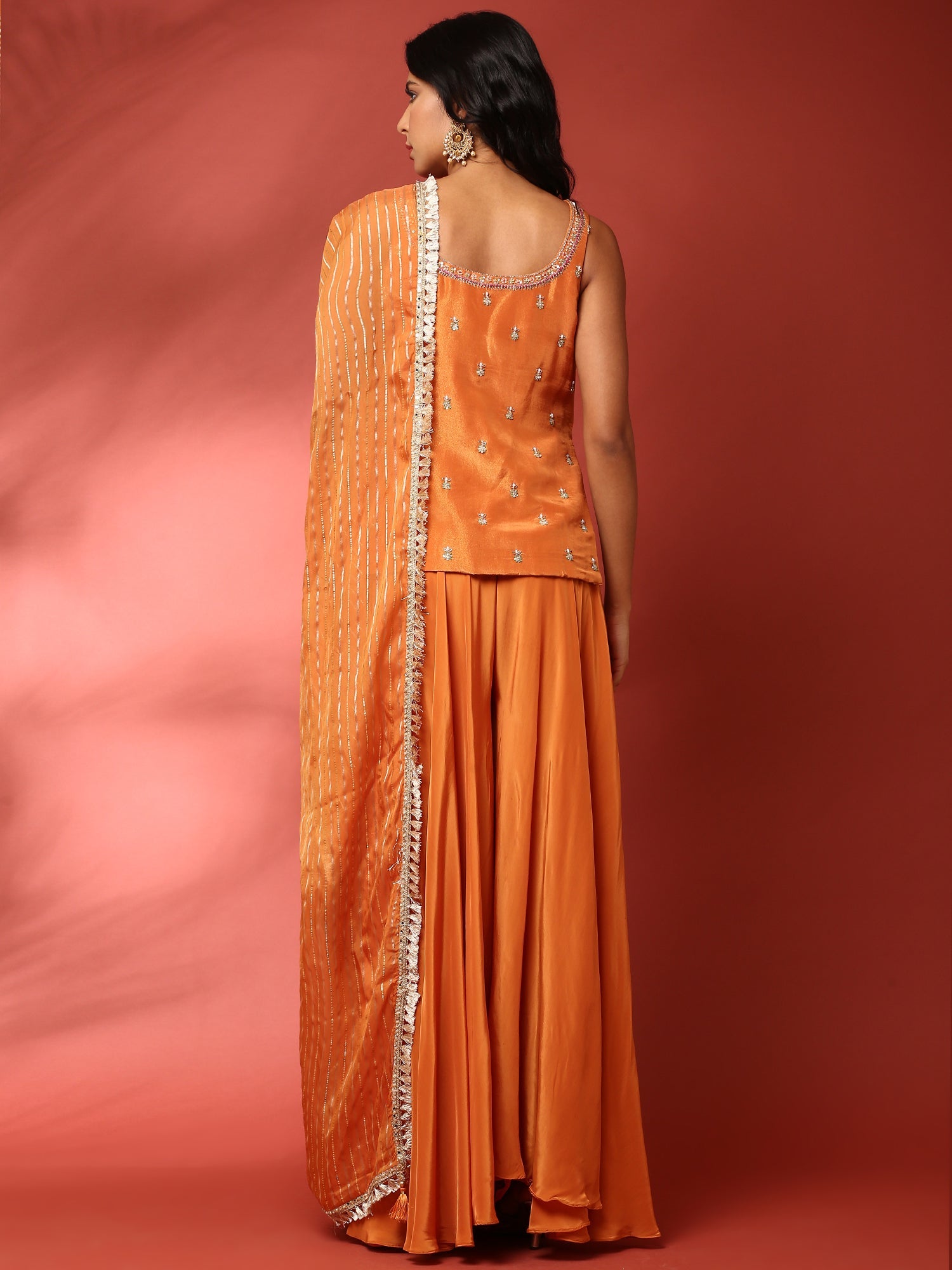 This burnt orange three-piece palazzo set showcases exquisite hand embroidery, combining traditional craftsmanship with modern sophistication. The flowing palazzo pants offer comfort and grace, while the detailed embroidery adds a refined touch to create a stylish, elegant ensemble perfect for special occasions.