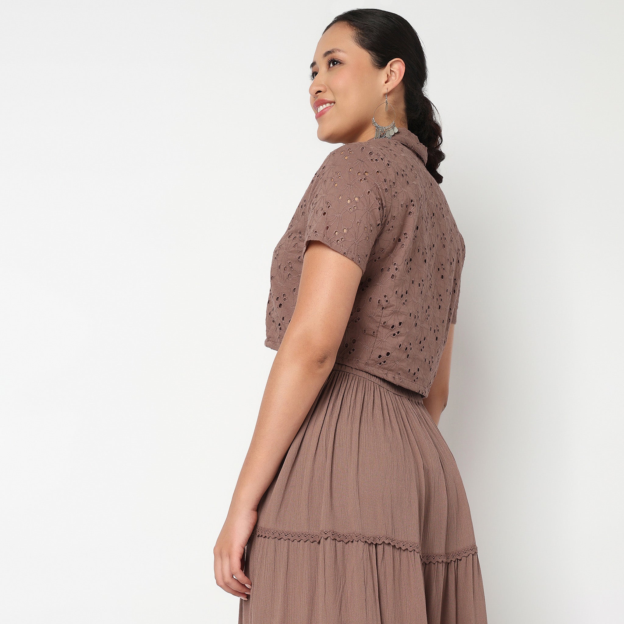 Elevate your wardrobe with our Camp Collar Crop Top, designed for women who appreciate a blend of comfort and style. Crafted from soft woven cotton, this top features a trendy Schiffi pattern that adds a unique touch to any outfit.