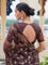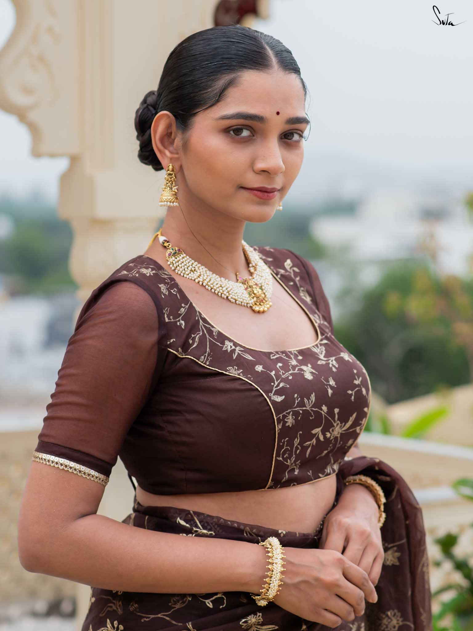 Elevate your festive and wedding look with Caramel Twist, an elegant half-sleeve blouse in rich brown foil organza. Adorned with delicate golden floral foil prints and intricate lace detailing, it exudes understated glamour with every twirl.