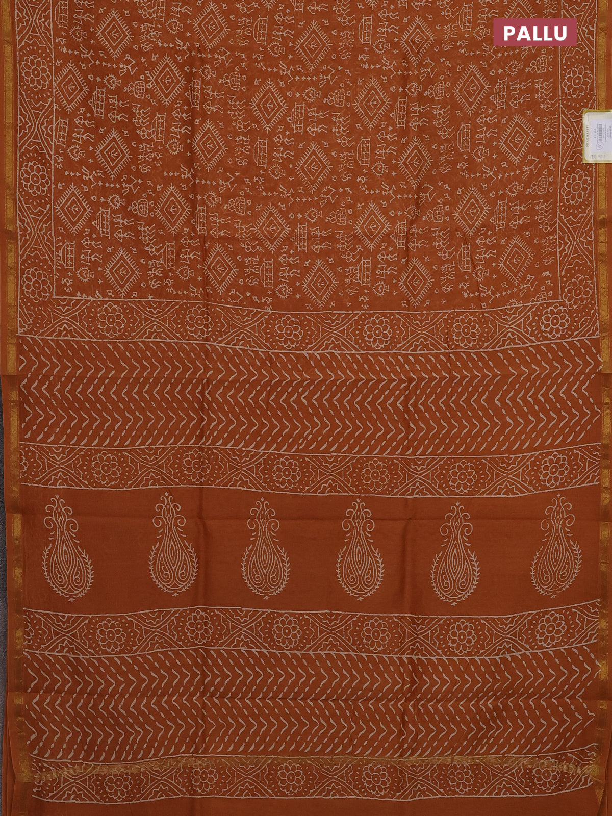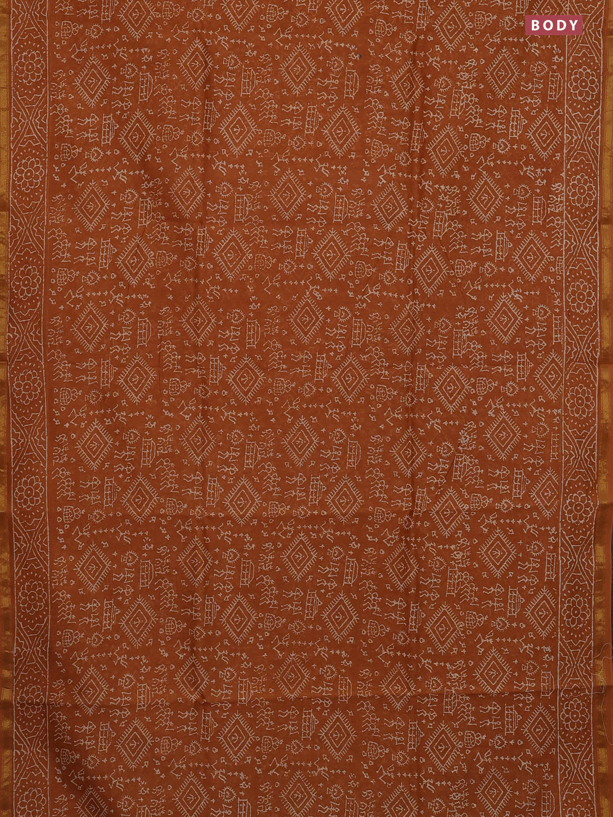 Chanderi bagru saree dark mustard with allover warli prints and small zari woven border