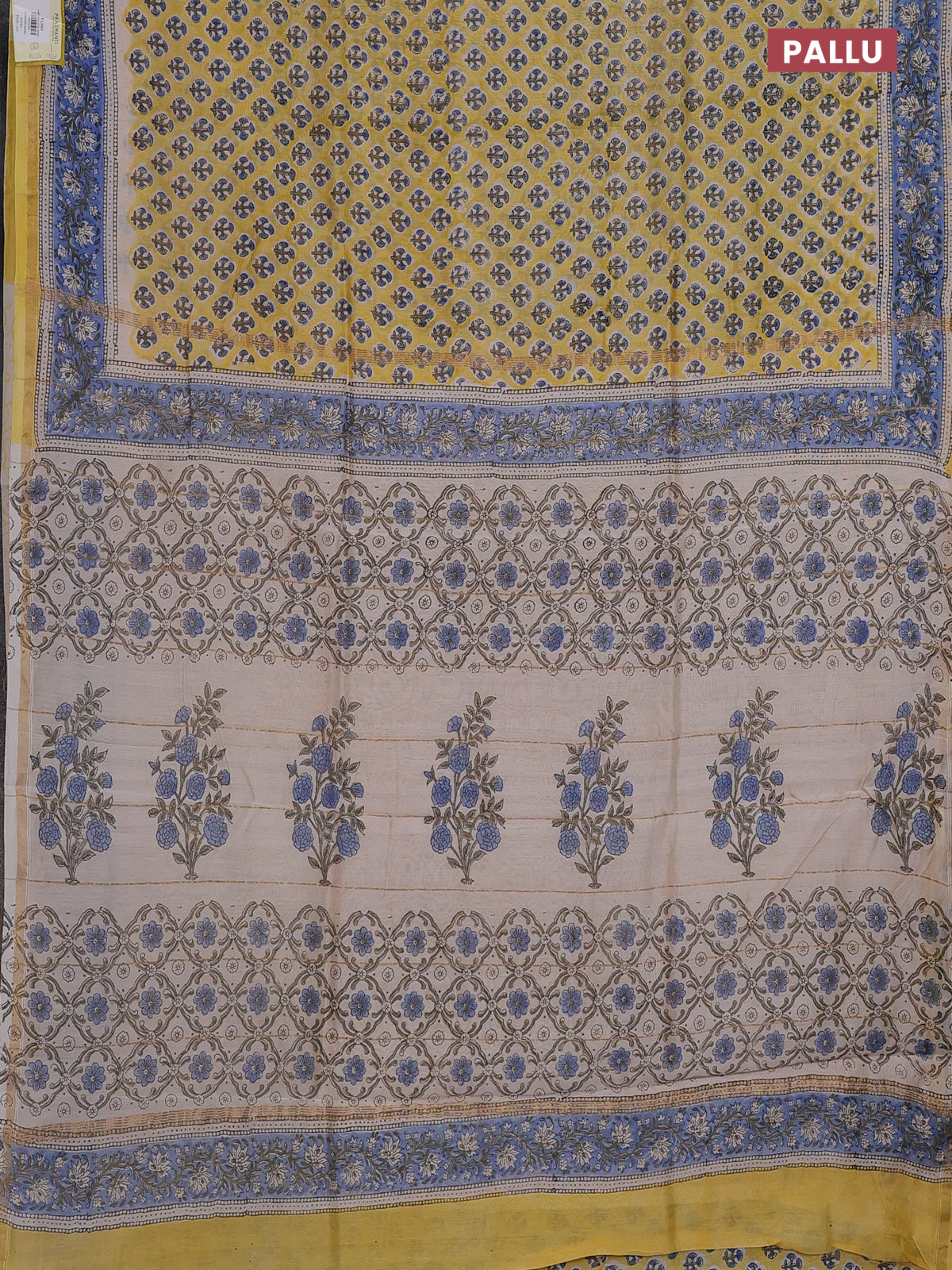 Chanderi bagru saree pale yellow and blue with allover floral butta prints and small zari woven border