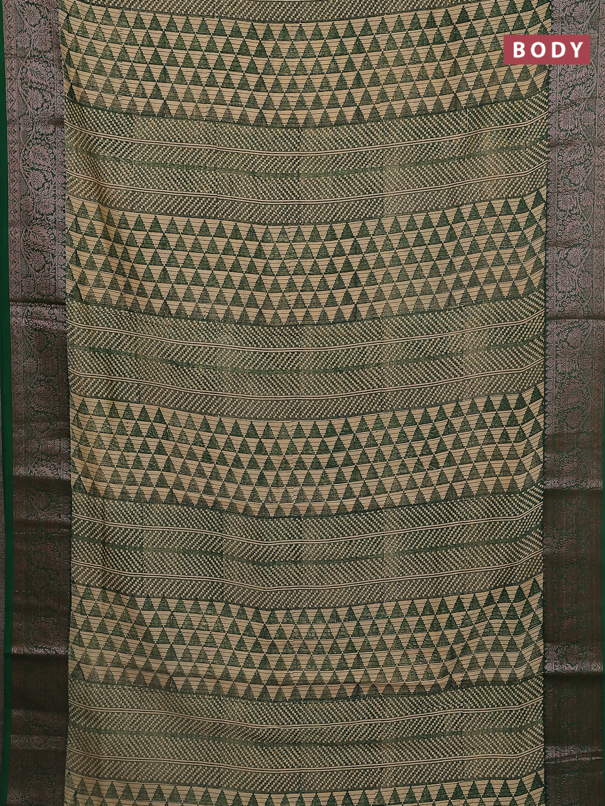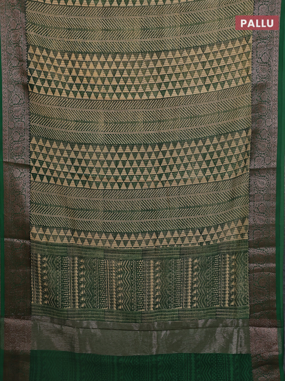 Chanderi silk cotton saree beige and green with allover prints and banarasi style border