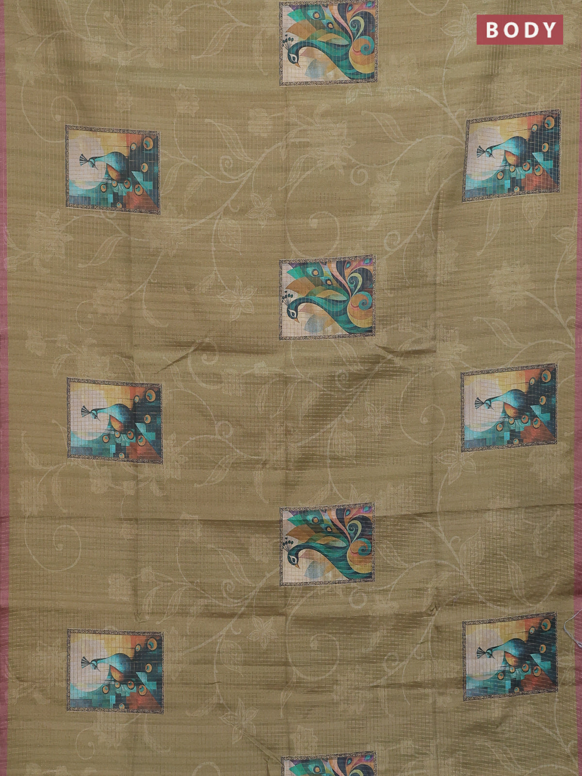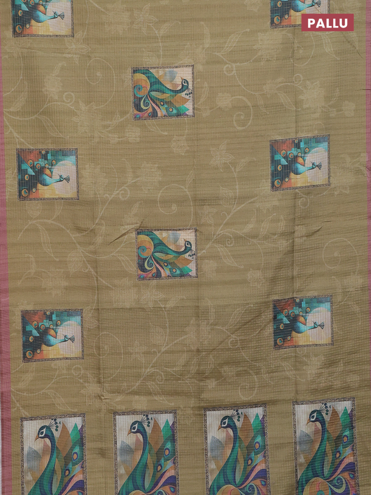 Chappa saree mehendi green and pastel brown with allover zari checked pattern & digital prints and printed pallu