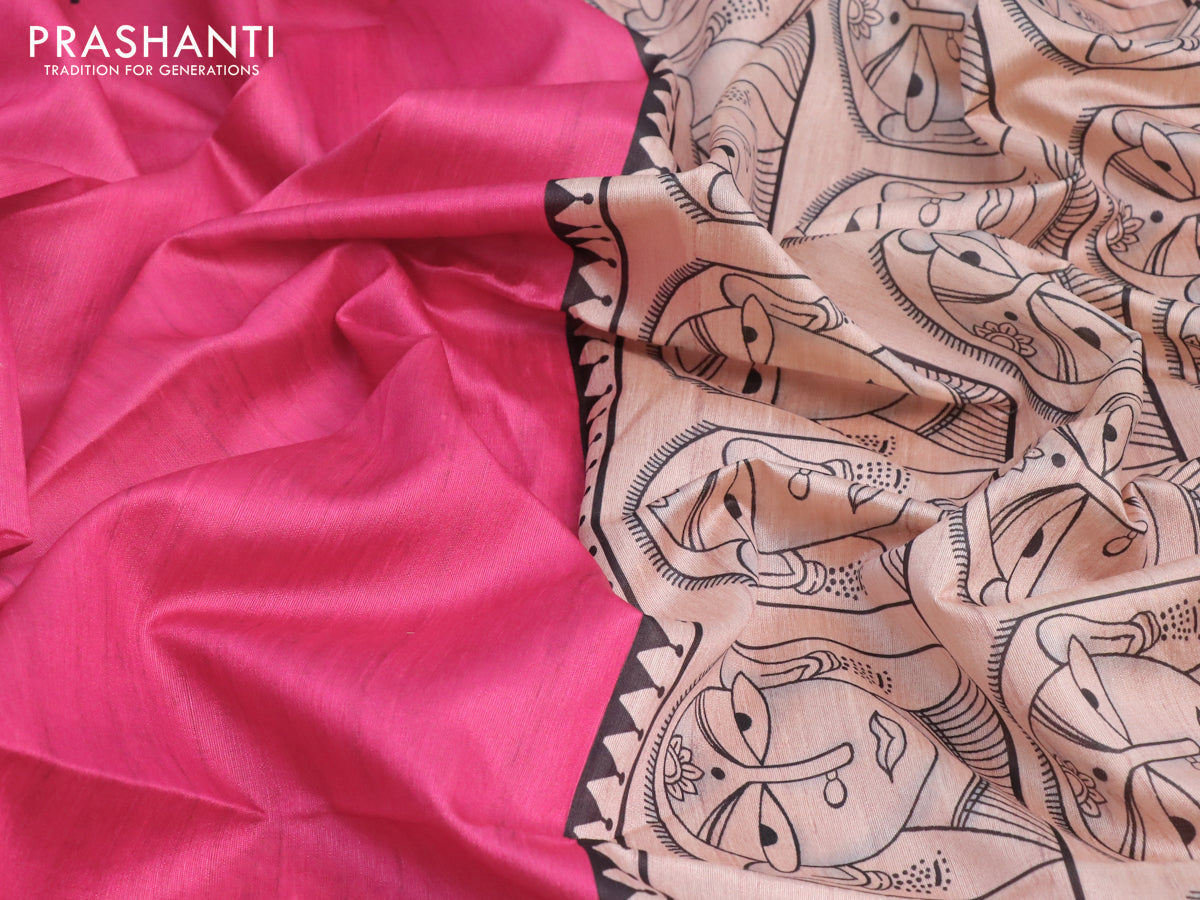 Chappa saree pink and beige with plain body and madhubani printed border