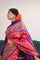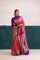 Beguiling in the shade of this Cherry Pink Kanjivaram Silk Saree with floral jaal pattern all across the body, which is teamed with contrast purple and gleaming gold zari woven floral motif pattern in the border and pallu.
