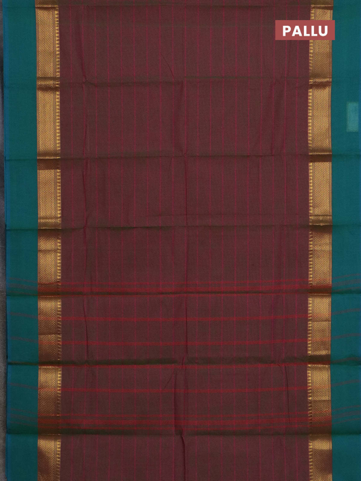 Chettinad cotton saree dual shade of maroon and teal green with allover stripe pattern and ganga jamuna border