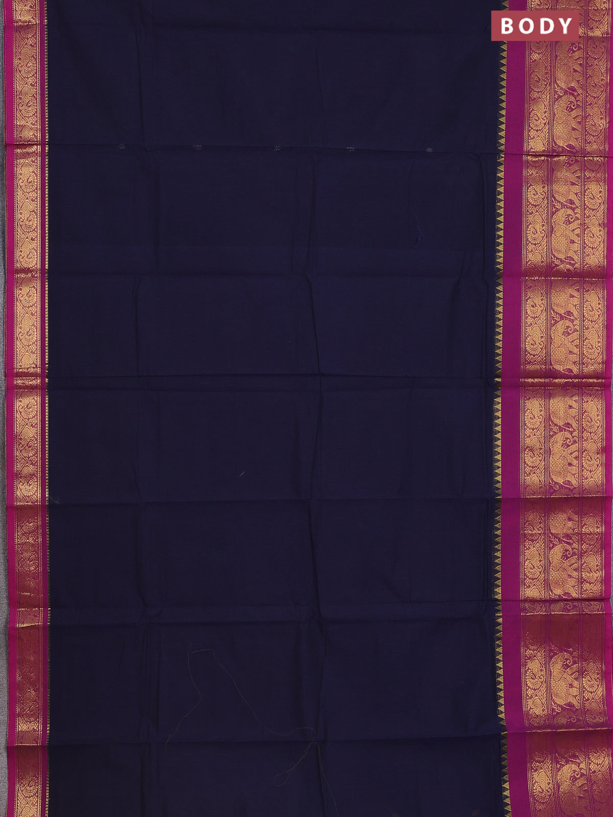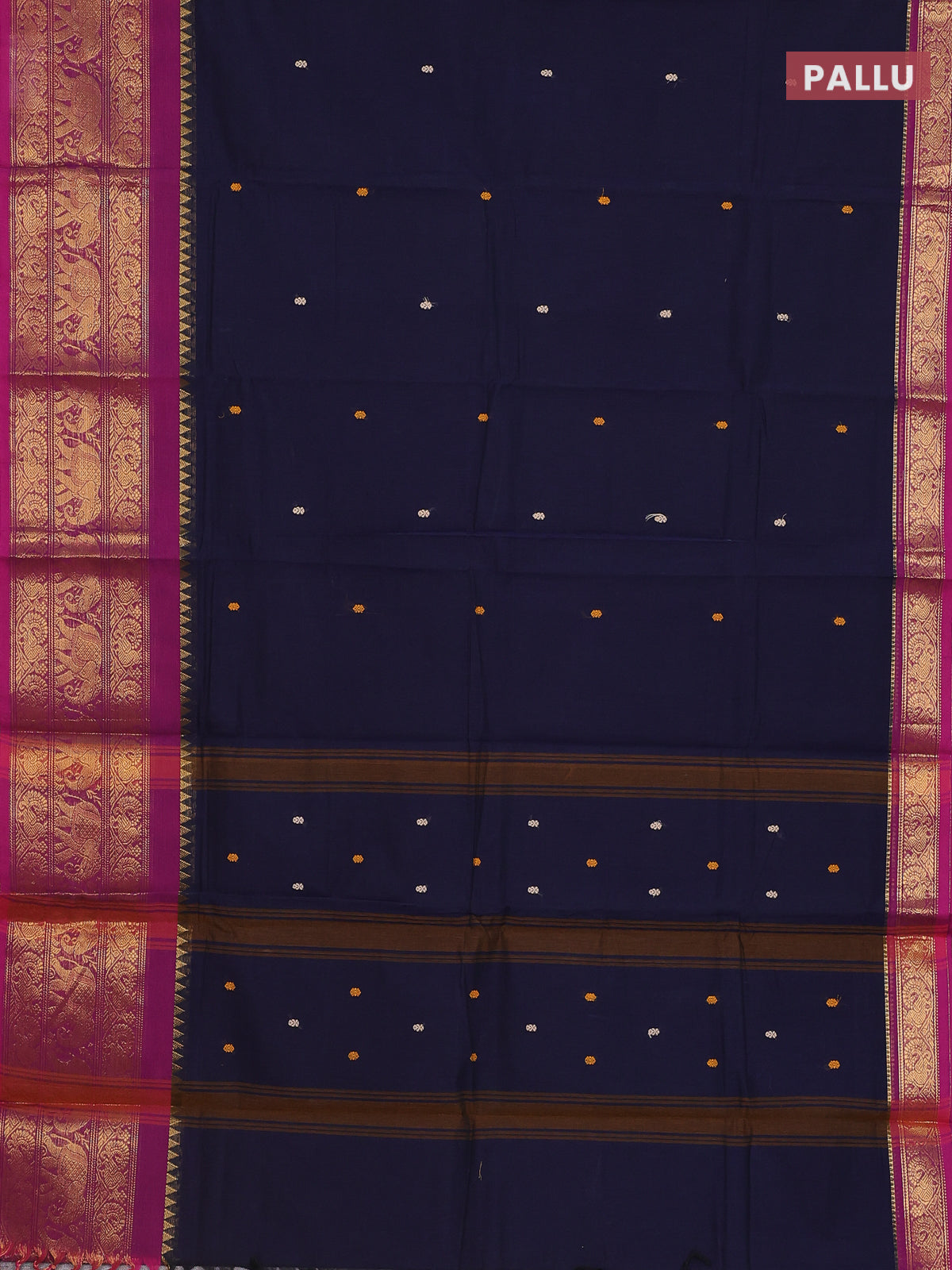 Chettinad cotton saree navy blue and magenta pink with thread woven buttas and annam & elephant zari woven border