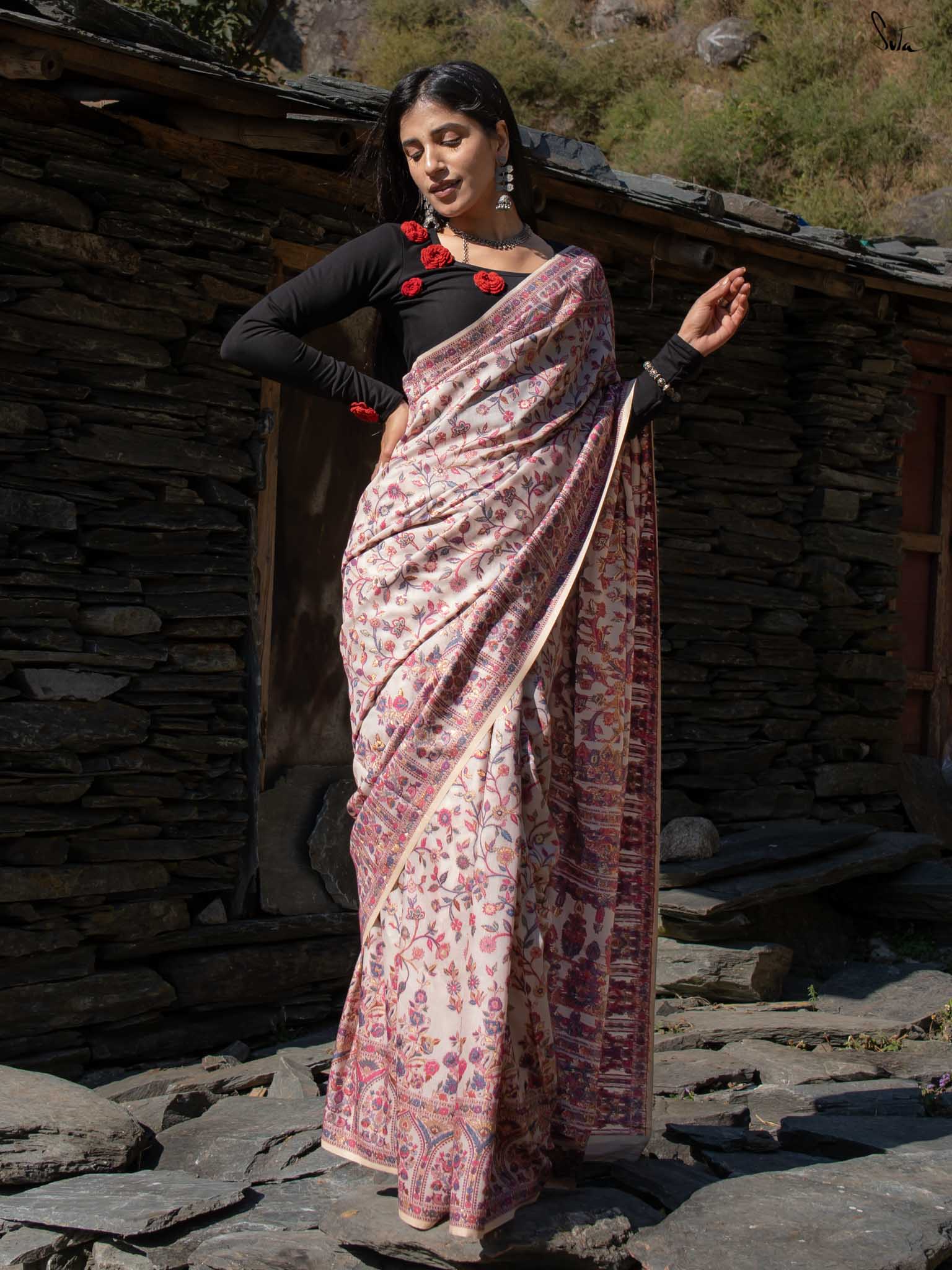 Chinar Pashm feels like autumn in Kashmir -soft, warm, and full of quiet beauty. Made from luxurious pashmina silk, this off-white saree is woven with bright, intricate patterns inspired by Chinar leaves in sunlight.