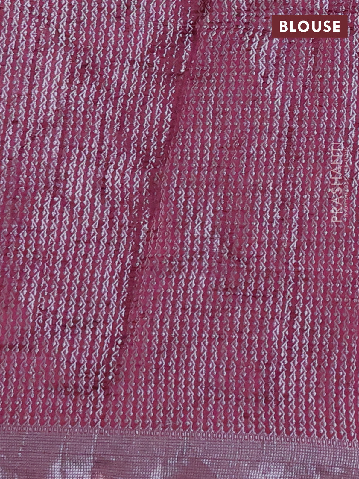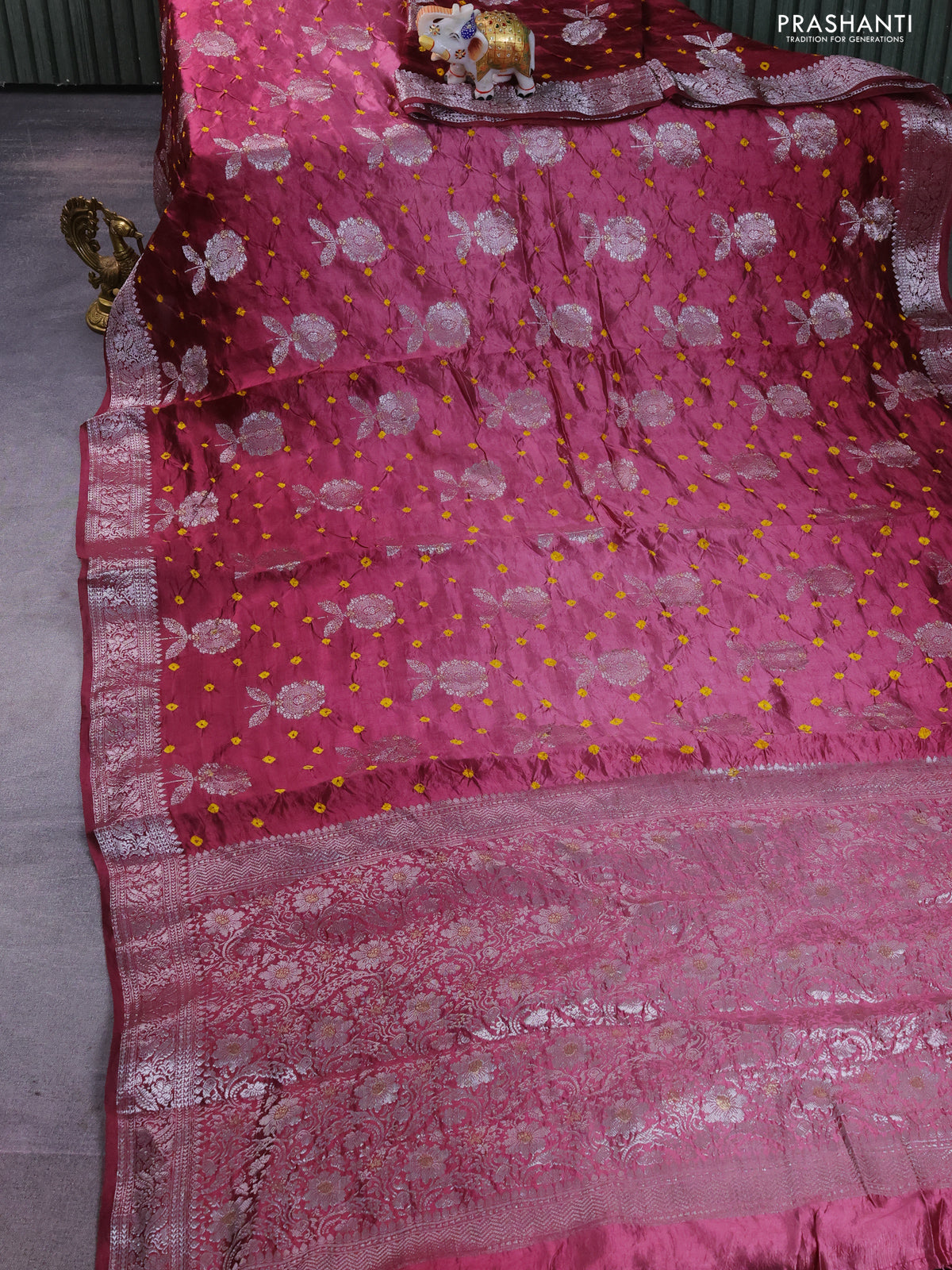 Chiniya silk saree wine shade with allover silver zari buttas & bandhini prints and silver zari woven border