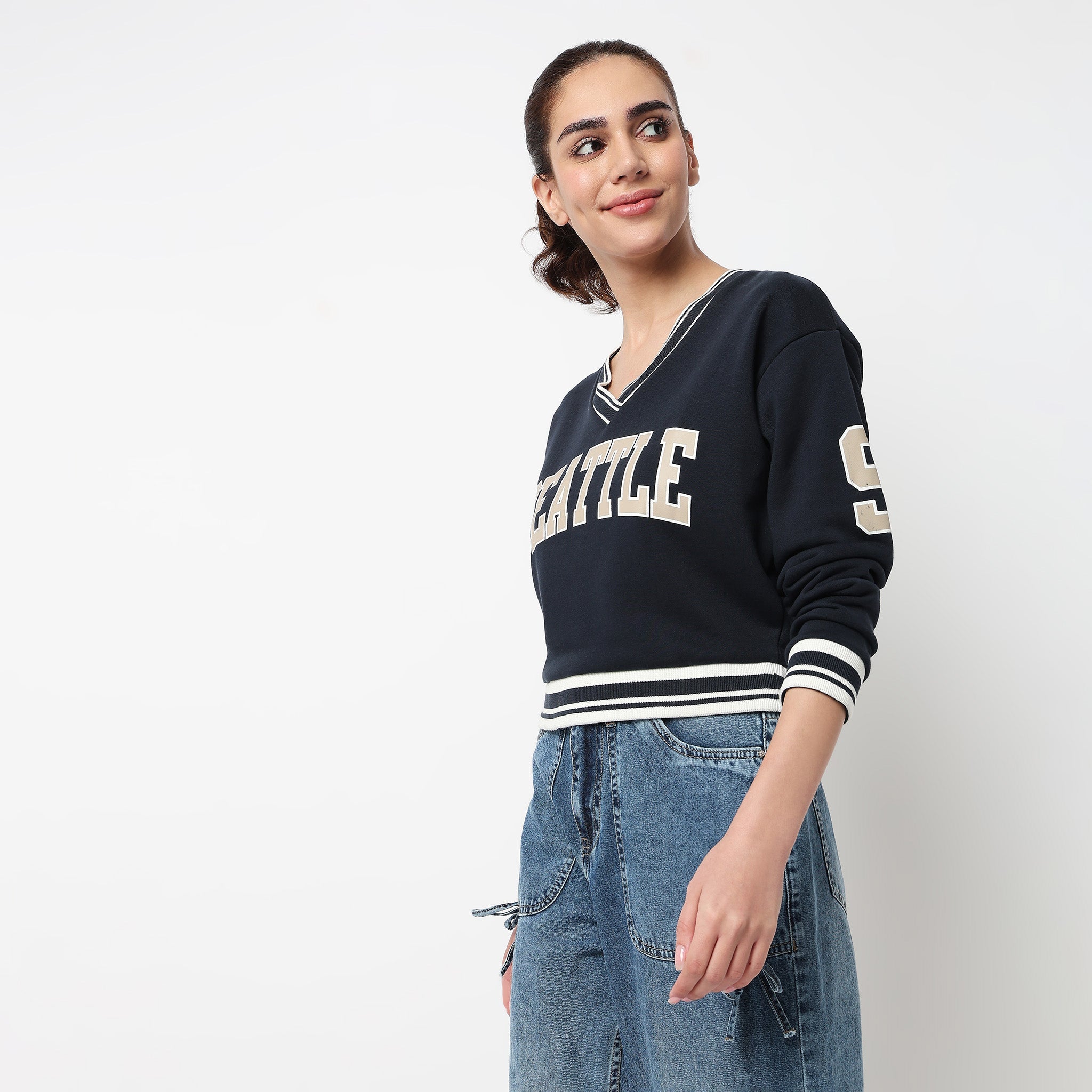 Elevate your casual wardrobe with our Cotton V-Neck Graphic Sweat Tee, designed for women who appreciate comfort and style. This cropped, oversize tee combines a trendy graphic pattern with the softness of knit cotton, making it a versatile addition to any outfit.